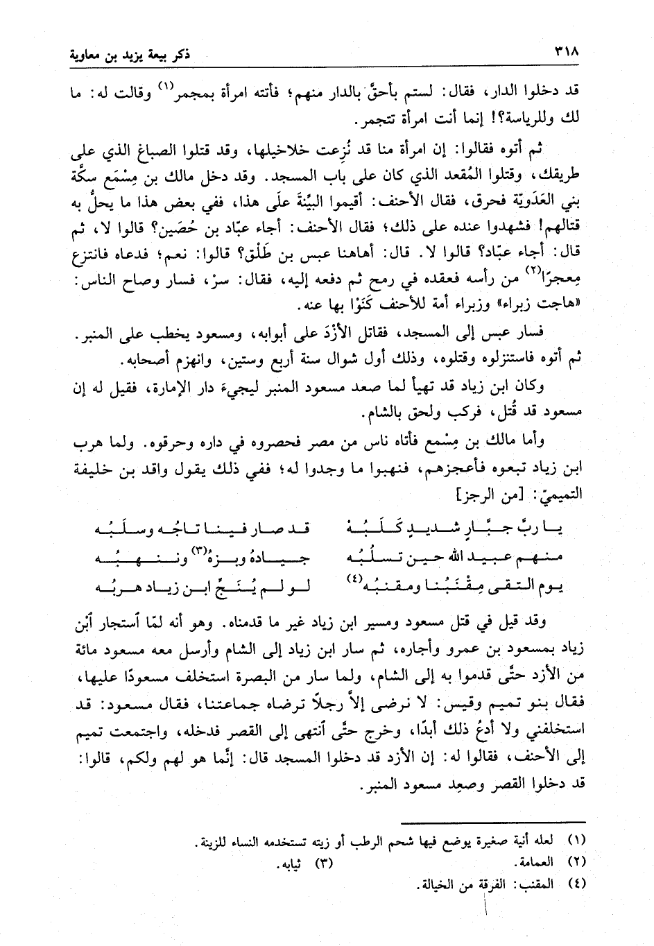 يوم التقى مقنبنا ومقنبه . . . لو لم ينج ابن زياد هربه وقد قيل في قتل مسعود ومسير ابن زياد غير ما قدمناه ، وهو أنه لما استجار ابن زياد بمسعود بن عمرو وأجاره ، ثم سار ابن زياد إلى الشام وأرسل معه مسعود مائة من الأزد حتى قدموا به إلى الشام ، ولما سار من البصرة استخلف مسعوداً عليها ، فقال بنو تميم وقيس : لا نرضى إلا رجلاً ترضاه جماعتنا ، فقال مسعود : قد استخلفني ولا أدع ذلك أبداً ، وخرج حتى انتهى إلى القصر فدخله ، واجتمعت تميم إلى الأحنف ، فاقالوا له : إن الأزد قد دخلوا المسجد قال : وخرج حتى انتهى إلى القصر فدخله ، واجتمعت تميم إلى الأحنف ، فاقالوا له : إن الأزد قد دخلوا المسجد قال : إنما هو لهم ولكم ، قالوا : قد دخلوا القصر وصعد مسعود المنبر .