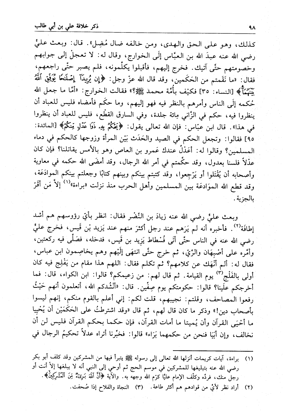 كذلك ، وهو على الحق والهدى ، ومن خالفه ضال مضل " . قال : وبعث عليٌ رضي الله عنه عبد الله بن العباس إلى الخوارج ، وقال له لا تعجل إلى جوابهم وخصومتهم حتى آتيك . فخرج إليهم ، فأقبلوا يكلمونه ، فلم يصبر حتى راجعهم ، فقال ، " ما نقمتم من الحكمين ، وقد قال الله عز وجل : إن يريدا إصلاحا يوفق الله بينهما فكيف بأمة محمد ( صلى الله عليه وسلم ) ؟ " . فقالت الخوارج : " أما ما جعل الله حكمه إلى الناس وأمرهم بالنظر فيه فهو إليهم ، وما حكم فأمضاه فليس للعباد أن ينظروا فيه ، حكم في الزاني مائة جلدة ، وفي السارق القطع ، فليس للعباد أن ينظروا في هذا " . قال ابن عباس : فإن الله تعالى يقول يحكم به ذوا عدل منكم فقالوا : وتجعل الحكم في الصيد والحدث بين المرأة وزوجها كالحكم في دماء المسلمين ؟ وقالوا له : أعدلٌ عندك عمرو بن العاص وهو بالأمس يقاتلنا ؟ فإن كان عدلاً فلسنا بعدول ، وقد حكمتم في أمر الله الرجال ، وقد أمضى الله حكمه في معاوية وأصحابه أن يقتلوا أو يرجعوا ، وقد كتبتم بينكم وبينهم كتاباً وجعلتم بينكم الموادعة ، وقد قطع الله الموادعة بين المسلمين وأهل الحرب منذ نزلت " براءة " إلا من أقر بالجزية .