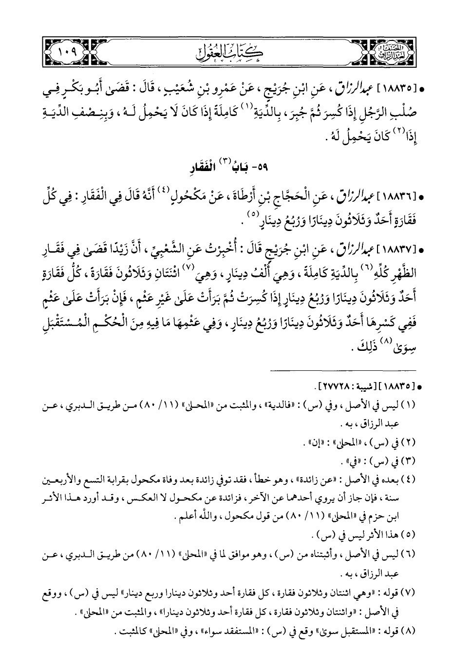 (¬٧) قوله: "وهي اثنتان وثلاثون فقارة، كل فقارة أحد وثلاثون دينارا وربع دينار" ليس في (س)، ووقع في الأصل: "واثنتان وثلاثون فقارة، كل فقارة أحد وثلاثون دينارا"، والمثبت من "المحلى".