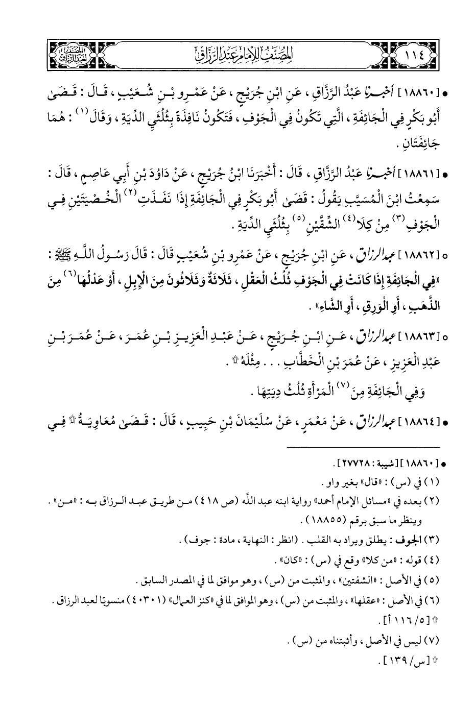° [١٨٨٦٢] عبد الرزاق، عَنِ ابْنِ جُرَيْجٍ، عَنْ عَمْرِو بْنِ شُعَيْبٍ قَالَ: قَالَ رَسُولُ اللَّهِ - صلى الله عليه وسلم -: "فِي الْجَائِفَةِ إِذَا كَانَتْ فِي الْجَوْفِ ثُلُثُ الْعَقْلِ، ثَلَاثَةٌ وَثَلَاثُونَ مِنَ الْإِبِلِ، أَوْ عَدْلُهَا (¬٦) مِنَ الذَّهَبِ، أَوِ الْوَرِقِ، أَوِ الشَّاءِ".