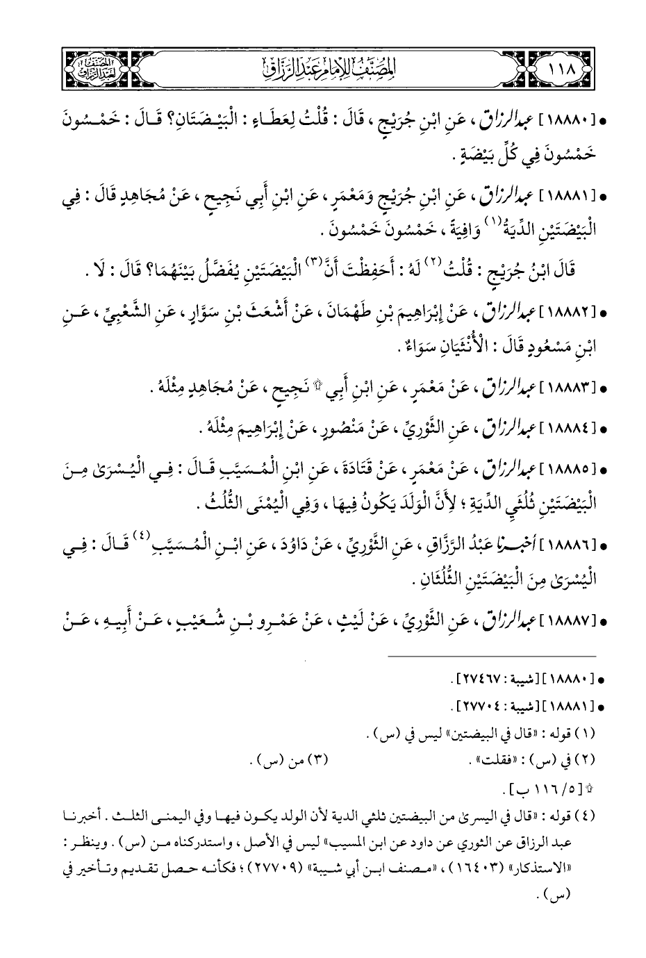 • [١٨٨٨١] عبد الرزاق، عَنِ ابْنِ جُرَيْجٍ وَمَعْمَرٍ، عَنِ ابْنِ أَبِي نَجِيحٍ، عَنْ مُجَاهِدٍ قَالَ: فِي الْبَيْضتَيْنِ الدِّيَةُ (¬١) وَافِيَةً، خَمْسُونَ خَمْسُونَ.