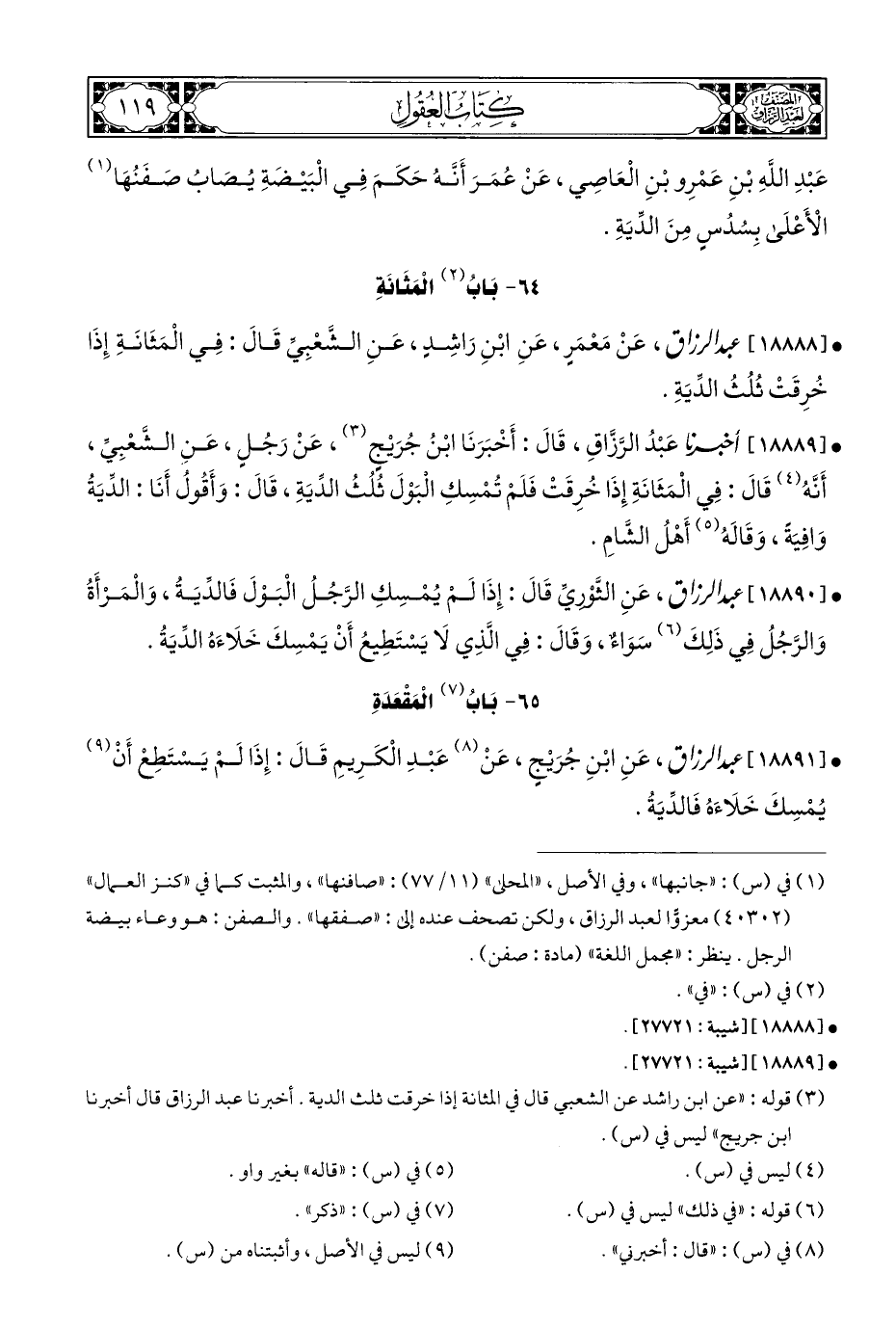 (¬٣) قوله: "عن ابن راشد عن الشعبي قال بها المثانة إذا خرقت ثلث الدية. أخبر نا عبد الرزاق قال أخبرنا ابن جريج" ليس في (س).
