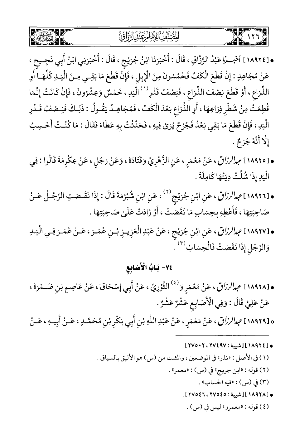 • [١٨٩٢٤] أخبرنا عَبْدُ الرَّزَّاقِ، قَالَ: أَخْبَرَنَا ابْنُ جُرَيْجٍ، قَالَ: أَخْبَرَنِي ابنُ أَبِي نَجِيحٍ، عَنْ مُجَاهِدٍ: إِنْ قَطَعَ الْكَفَّ فَخَمْسُونَ مِنَ الْإِبِلِ، فَإِنْ قَطَعَ مَا بَقِي مِنَ الْيَدِ كُلِّهَا أَوِ الذِّرَاعِ، أَوْ قَطَعَ نِصْفَ الذِّرَاعِ، فَنِصْفُ قَدْرِ (¬١) الْيَدِ، خَمْسٌ وَعَشْرُونَ، فَإِنْ كَانَتْ إِنَّمَا قُطِعَتْ مِنْ شَطْرِ ذِرَاعَهَا، أَوِ الذِّرَاعِ بَعْدَ الْكَفِّ، فَمُجَاهِدٌ يَقُولُ: ذَلِكَ فَنِصْفُ قَدْرِ الْيَدِ، فَإِنْ قَطَعَ مَا بَقِي بَعْدُ فَجُرْحٌ يُرَى فِيهِ، فَحَدَّثْتُ بِهِ عَطَاءً فَقَالَ: مَا كُنْتُ أَحْسِبُ إِلَّا أَنَّهُ جُرْحٌ.