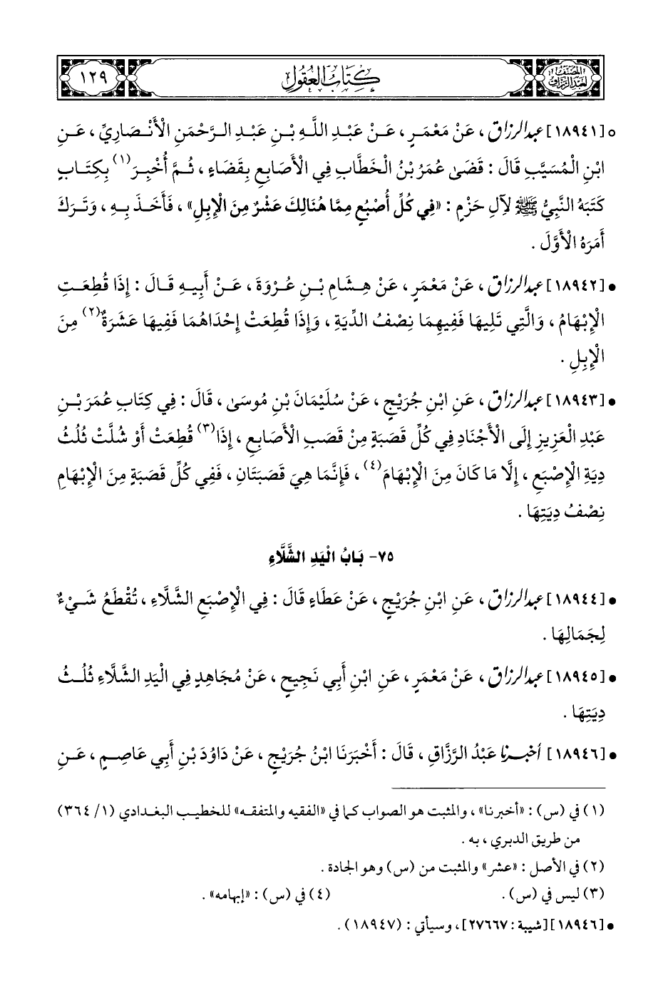 ° [١٨٩٤١] عبد الرزاق، عَنْ مَعْمَرٍ، عَنْ عَبْدِ اللهِ بْنِ عَبْدِ الرَّحْمَنِ الْأَنْصَارِيِّ، عَنِ ابْنِ الْمُسَيَّبِ قَالَ: قَضَى عُمَرُ بْنُ الْخَطَّابِ فِي الْأَصَابِعِ بِقَضَاءٍ، ثُمَّ أُخْبِرَ (¬١) بِكِتَابٍ كَتَبَهُ النَّبِيُّ - صلى الله عليه وسلم - لآِلِ حَزْمٍ: "فِي كُلِّ أُصْبُعٍ مِمَّا هُنَالِكَ عَشْرٌ مِنَ الإبِلِ"، فَأَخَذَ بِهِ، وَتَرَكَ أَمَرَهُ الْأَوَّلَ.