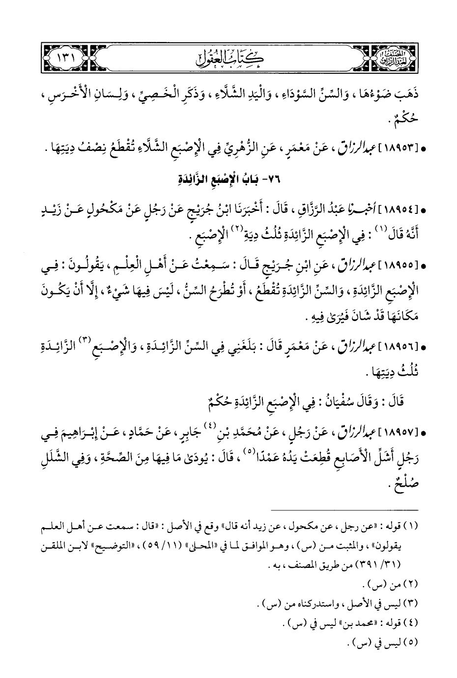 • [١٨٩٥٤] أخبرنا عَبْدُ الرَّزاقِ، قَالَ: أَخْبَرَنَا ابْنُ جُرَيْجٍ عَنْ رَجُلٍ عَنْ مَكْحُولٍ عَنْ زَيْدٍ أَنَّهُ قَالَ (¬١): فِي الْإِصْبَعِ الزائِدَةِ ثُلُثُ دِيَةِ (¬٢) الْإِصْبَعِ.