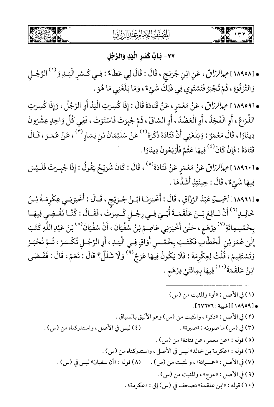 • [١٨٩٦١] أخبرنا عَبْدُ الرَّزَّاقِ، قَالَ: أَخْبَرَنَا ابْنُ جُرَيْجٍ، قَالَ: أَخْبَرَنِي عِكْرِمَةُ بْنُ خَالِدٍ (¬٦) أَنَّ نَافِعَ بْنَ عَلْقَمَةَ أُتِيَ فِي رِجْلٍ كُسِرَتْ، فَقَالَ: كُنَّا نَقْضِي فِيهَا بِخَمْسِمَائَةِ (¬٧) دِرْهَمٍ، حَتَّى أَخْبَرَنِي عَاصِمُ بْنُ سُفْيَانَ، أَن سُفْيَانَ (¬٨) بْنَ عَبْدِ اللهِ كَتَبَ إِلَى عُمَرَ بْنِ الْخَطَّابِ فَكَتَبَ بِخَمْسِ أَوَاقٍ فِي الْيَدِ، أَوِ الرِّجْلِ تُكْسَر، ثُمَّ تُجْبَرُ وَتَسْتَقِيم، قُلْتُ لِعِكْرِمَةَ: فَلَا يَكُونُ فِيهَا عَرَجٌ (¬٩) وَلَا شَلَلٌ؟ قَالَ: نَعَمْ، قَالَ: فَقَضَى ابْنُ عَلْقَمَةَ (¬١٠) فِيهَا بِمِائَتَيْ دِرْهَمٍ.