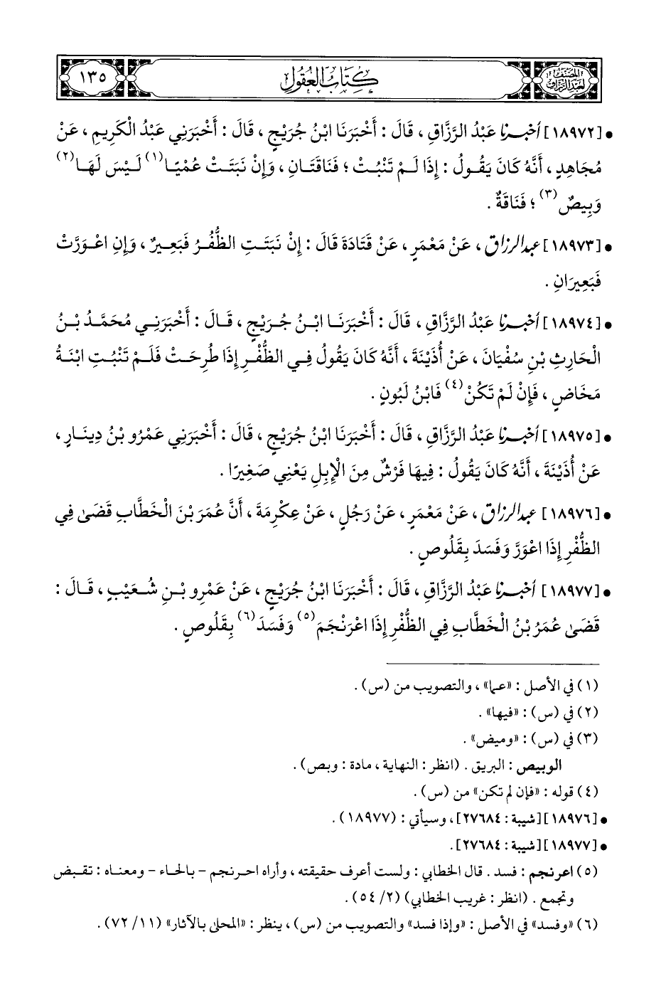 • [١٨٩٧٧] أخبرنا عَبْدُ الرَّزَّاقِ، قَالَ: أَخْبَرَنَا ابْنُ جُرَيْجٍ، عَنْ عَمْرِو بْنِ شُعَيْبٍ، قَالَ: قَضَى عُمَرُ بْنُ الْخَطابِ فِي الظُّفْرِ إِذَا اعْرَنْجَمَ (¬٥) وَفَسَدَ (¬٦) بِقَلُوصٍ.