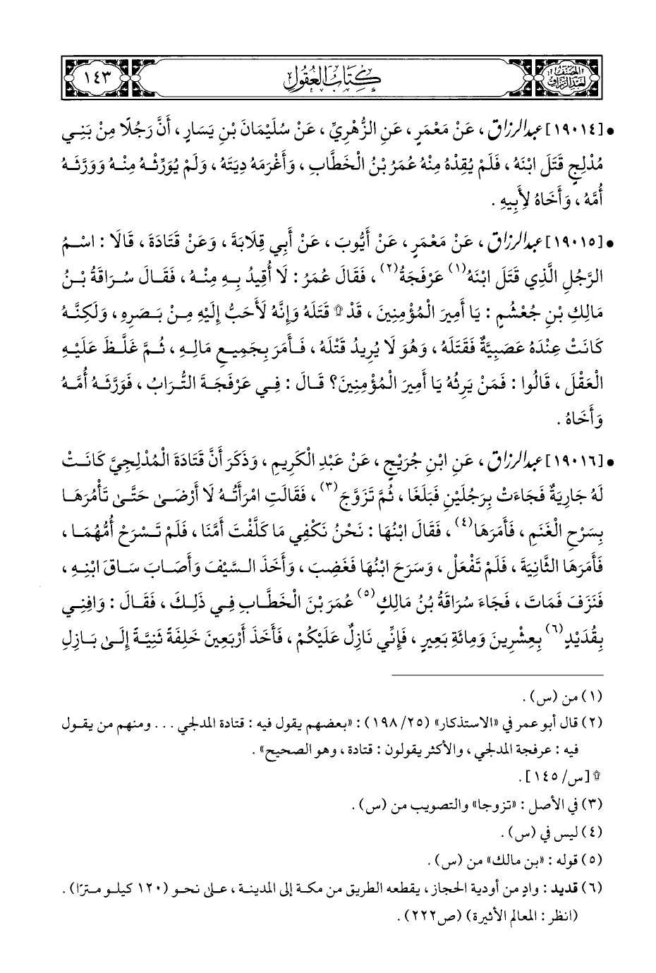 • [١٩٠١٦] عبد الرزاق، عَنِ ابْنِ جُرَيْجٍ، عَنْ عَبْدِ الْكَرِيمِ، وَذَكَرَ أَنَّ قَتَادَةَ الْمُدْلِجِيَّ كَانَتْ لَهُ جَارِيَةٌ فَجَاءَتْ بِرَجُلَيْنِ فَبَلَغَا، ثُمَّ تَزَوَّجَ (¬٣)، فَقَالَتِ امْرَأَتُهُ لَا أَرْضَى حَتَّى تَأْمُرَهَا بِسَرْحِ الْغَنَمِ، فَأَمَرَهَا (¬٤)، فَقَالَ ابْنُهَا: نَحْنُ نَكْفِي مَا كَلَّفْتَ أَمَّنَا، فَلَمْ تَسْرَحْ أُمُّهُمَا، فَأَمَرَهَا الثَّانِيَةَ، فَلَمْ تَفْعَلْ، وَسَرَحَ ابْنُهَا فَغَضِبَ، وَأَخَذَ السَّيْفَ وَأَصَابَ سَاقَ ابْنِهِ، فَنَزَفَ فَمَاتَ، فَجَاءَ سُرَاقَةُ بُنُ مَالِكٍ (¬٥) عُمَرَ بْنَ الْخَطَّابِ فِي ذَلِكَ، فَقَالَ: وَافِنِي بِقُدَيْدٍ (¬٦) بِعِشْرِينَ وَمِائَةِ بَعِيرٍ، فَإِنِّي نَازِل عَلَيْكُمْ، فَأَخَذَ أَرْبَعِينَ خَلِفَةَ ثَنِيَّة إِلَى بَازِلِ