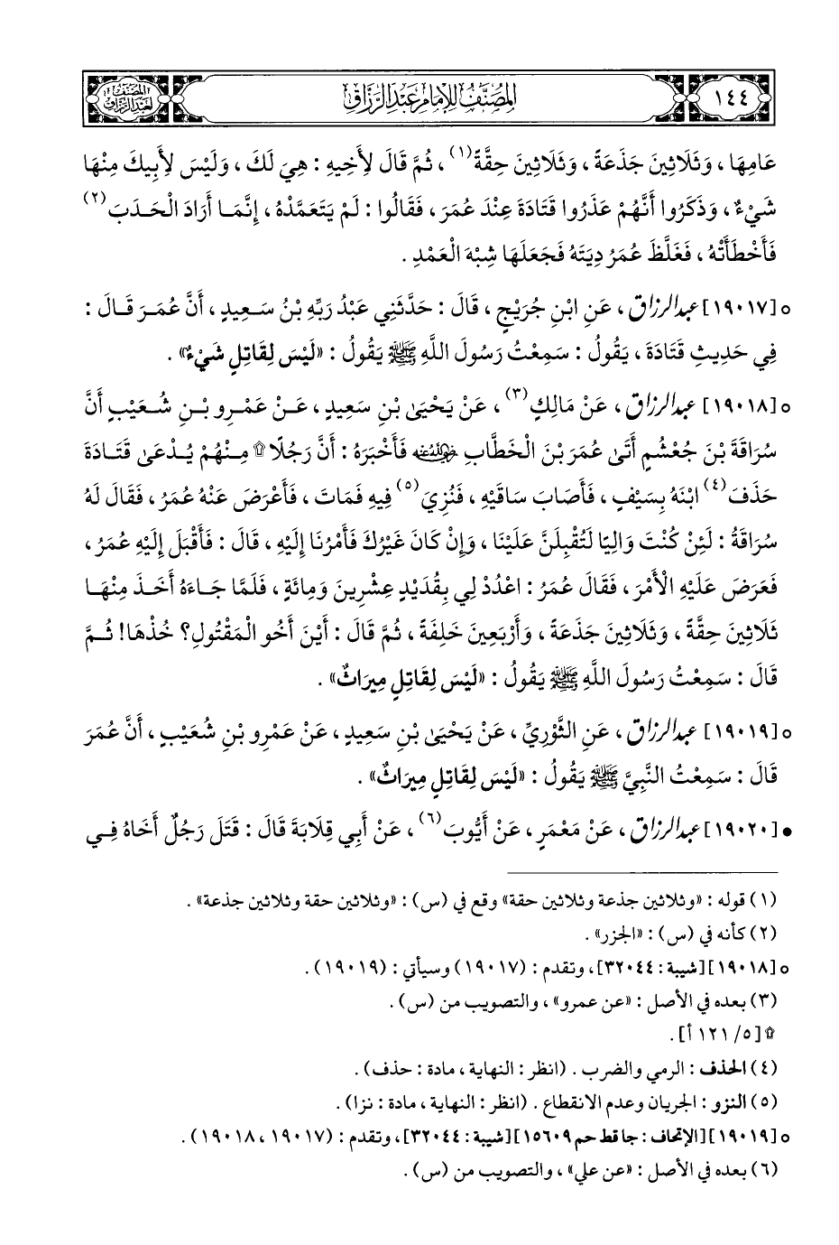 ° [١٩٠١٨] عبد الرزاق، عَنْ مَالِكٍ (¬٣)، عَنْ يَحْيَى بْنِ سَعِيدٍ، عَنْ عَمْرِو بْنِ شُعَيْبٍ أَنَّ سُرَاقَةَ بْنَ جُعْشُمٍ أَتَى عُمَرَ بْنَ الْخَطَّابِ - رضي الله عنه - فَأَخْبَرَهُ: أَنَّ رَجُلًا (*) مِنْهُمْ يُدْعَى قَتَادَةَ حَذَفَ (¬٤) ابْنَهُ بِسَيْفٍ، فَأَصَابَ سَاقَيْهِ، فَنُزِيَ (¬٥) فِيهِ فَمَاتَ، فَأَعْرَضَ عَتهُ عُمَر، فَقَالَ لَهُ سُرَاقَةُ: لَئِنْ كُنْتَ وَالِيًا لَتُقْبِلَنَّ عَلَيْنَا، وَإِنْ كَانَ غَيْرُكَ فَأَمْرُنَا إِلَيْهِ، قَالَ: فَأَقْبَلَ إِلَيْهِ عُمَر، فَعَرَضَ عَلَيْهِ الْأَمْرَ، فَقَالَ عُمَرُ: اعْدُدْ لِي بِقُدَيْدٍ عِشْرِينَ وَمِائَةٍ، فَلَمَّا جَاءَهُ أَخَذَ مِنْهَا ثَلَاثِينَ حِقَّةً، وَثَلَاثِينَ جَذَعَةً، وَأَرْبَعِينَ خَلِفَةً، ثُمَّ قَالَ: أَيْنَ أَخُو الْمَقْتُولِ؟ خُذْهَا! ثُمَّ قَالَ: سَمِعْتُ رَسُولَ اللهِ - صلى الله عليه وسلم - يَقُولُ: "لَيْسَ لِقَاتِلٍ مِيرَاثٌ".