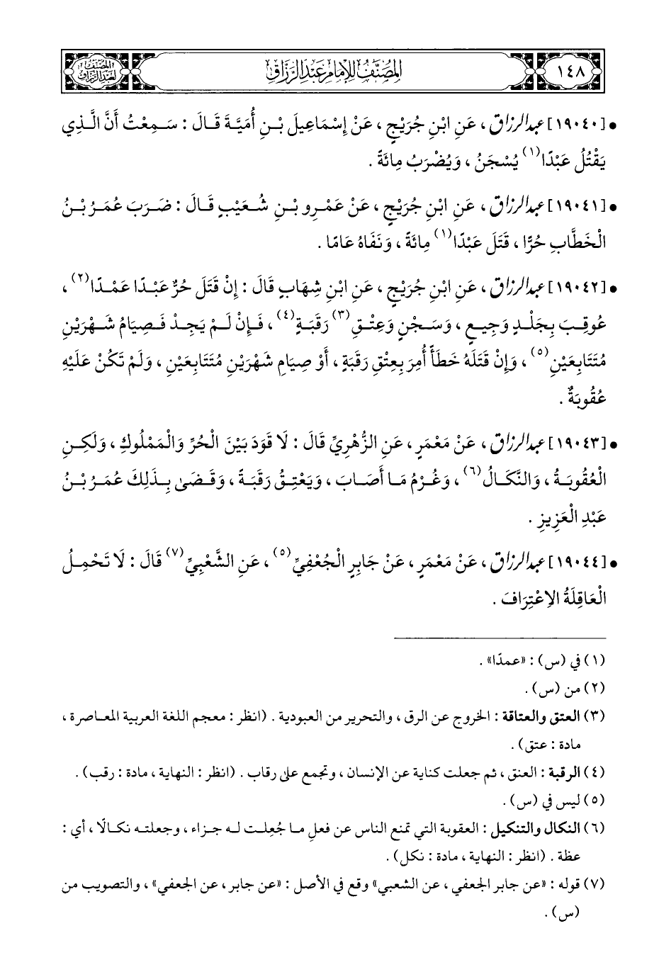 • [١٩٠٤١] عبد الرزاق، عَنِ ابْنِ جُرَيْجٍ، عَنْ عَمْرِو بْنِ شُعَيْبٍ قَالَ: ضَرَبَ عُمَرُ بْنُ الْخَطَّابِ حُرًّا، قَتَلَ عَبْدًا (¬١) مِائَةً، وَنَفَاهُ عَامًا.