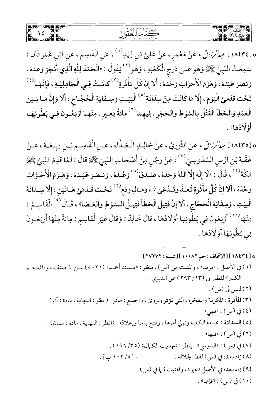 ° [١٨٤٣٥] عَبْدُ الرَّزَّاقِ، عَنِ الثَّوْرِيِّ، عَنْ خَالِدٍ الْحَذَّاءِ، عَنِ الْقَاسِمِ بْنِ رَبِيعَةَ، عَنْ عُقْبَةَ بْنِ أَوْسٍ السَّدُوسِيِّ (¬٧)، عَنْ رَجُلٍ مِنْ أَصْحَابِ النَّبِيِّ - صلى الله عليه وسلم - قَالَ: لَمَّا قَدِمَ النَّبِي - صلى الله عليه وسلم - مَكَّةَ (٢)، قَالَ: "لَا إِلَهَ إِلَّا اللَّهُ وَحْدَهُ، صَدَقَ (¬٨) وَعْدَهُ، وَنَصَرَ عَبْدَهُ، وَهَزَمَ الْأَحْزَابَ وَحْدَهُ، أَلَا إِنَّ كُلَّ مَأثُرَةٍ تُعَدُّ وَتُدَّعَى *، وَمَالٍ وَدَمٍ (٢) تَحْتَ قَدَمَيَّ هَاتَينِ، إِلَّا سِدَانَةَ الْبَيْتِ، وَسِقَايَةَ الحُجَّاجِ، أَلَا إِنَّ قَتِيلَ الْخَطَأَ قَتِيلُ السَّوطِ وَالْعَصَا"، قَالَ (¬٩) الْقَاسِمُ: مِنْهَا (¬١٠) أَرْبَعُونَ فِي بُطونِهَا أَوْلَادُهَا، قَالَ خَالِدٌ: وَقَالَ غَيْرُ الْقَاسمِ: مِائَةٌ مِنْهَا أَرْبَعُونَ فِي بُطُونِهَا أَوْلَادُهَا.