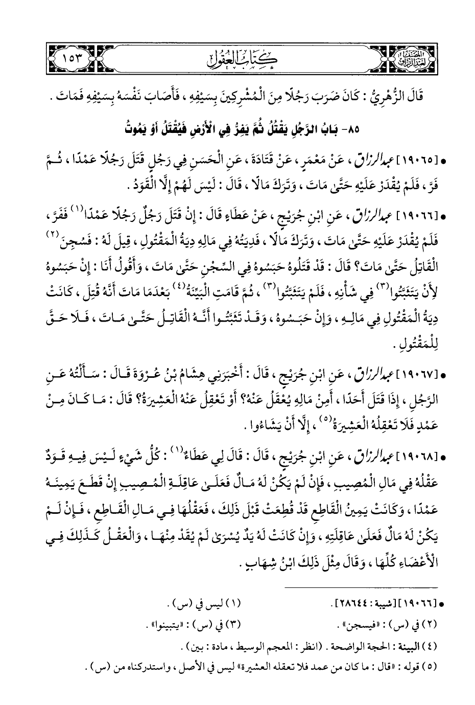• [١٩٠٦٦] عبد الرزاق، عَنِ ابْنِ جُرَيْجٍ، عَنْ عَطَاءٍ قَالَ: إِنْ قَتَلَ رَجُلٌ رَجُلًا عَمْدًا (¬١) فَفَرَّ، فَلَمْ يُقْدَرْ عَلَيْهِ حَتَّى مَاتَ، وَتَرَكَ مَالًا، فَدِيَتُهُ فِي مَالِهِ دِيَةُ الْمَقْتُولِ، قِيلَ لَهُ: فَسُجِنَ (¬٢) الْقَاتِلُ حَتَّى مَاتَ؟ قَالَ: قَدْ قَتَلُوهُ حَبَسُوهُ فِي السِّجْنِ حَتَّى مَاتَ، وَأَقُولُ أَنَا: إِنْ حَبَسُوهُ لِأَنْ يَتَثَبَّتُوا (¬٣) فِي شَأْنِهِ، فَلَمْ يَتَثَبَّتُوا (¬٣)، ثُمَّ قَامَتِ الْبَيِّنَةُ (¬٤) بَعْدَمَا مَاتَ أَنَّهُ قُتِلَ، كَانَتْ دِيَةُ الْمَقْتُولِ فِي مَالِهِ، وَإِنْ حَبَسُوه، وَقَدْ تَثَبَّتُوا أَنَّهُ الْقَاتِلُ حَتَّى مَاتَ، فَلَا حَقَّ لِلْمَقْتُولِ.