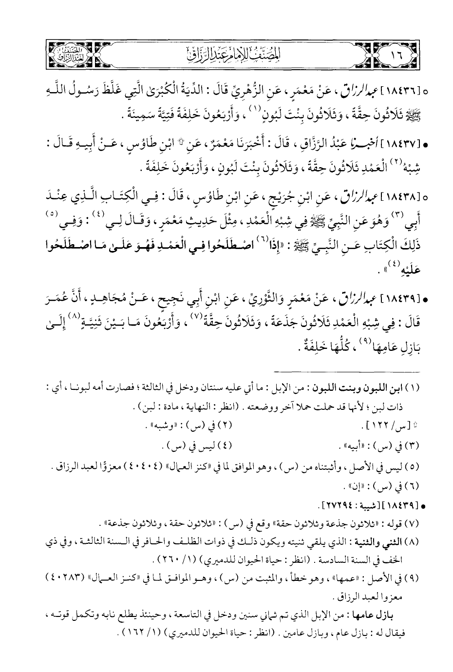 ° [١٨٤٣٦] عَبْدُ الرَّزَّاقِ، عَنْ مَعْمَرٍ، عَنِ الزُّهْرِيِّ قَالَ: الدِّيَةُ الْكُبْرَى الَّتِي غَلَّظَ رَسُولُ اللَّهِ - صلى الله عليه وسلم - ثَلَاثُونَ حِقَّةً، وَثَلَاثُونَ بِنْتَ لَبُونٍ (¬١)، وَأَرْبَعُونَ خَلِفَةً فَتِيَّةً سَمِينَةً.
