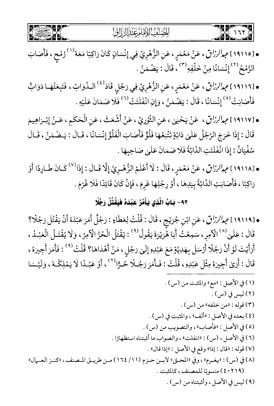 • [١٩١١٥] عبد الرزاق، عَنْ مَعْمَرٍ، عَنِ الزُّهْرِيِّ فِي إِنْسَانٍ كَانَ رَاكِبًا مَعَهُ (¬١) رُمْحٍ، فَأَصَابَ الرُّمْحُ (¬٢) إِنْسَانًا مِنْ خَلْفِهِ (¬٣)، قَالَ: يَضْمَنُ.