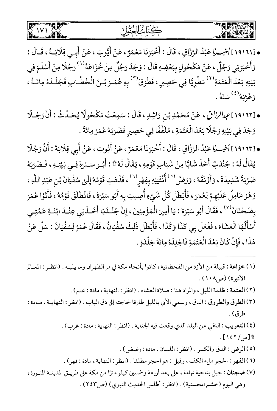 • [١٩١٦٣] أخبرنا عَبْدُ الرَّزَّاقِ، قَالَ: أَخْبَرَنَا مَعْمَرٌ، عَنْ أَيُّوبَ، عَنْ أَبِي قِلَابَةَ: أَنَّ رَجُلًا يُقَالُ لَهُ: جُنْدَبٌ أَخَذَ شَابًّا مِنْ شَبَابِ قَوْمِهِ، يُقَالُ لَهُ (*): أَبُو سَبْرَةَ فِي بَيْتِهِ، فَضَرَبَهُ ضَرْبَةً شَدِيدَةً، وَأَوْثَقَه، وَرَضَّ (¬٥) أُنْثَيَيْهِ بِفِهْرٍ (¬٦)، فَذَهَبَ قَوْمُهُ إِلَى سُفْيَانَ بْنِ عَبْدِ اللهِ، وَهُوَ عَامِلٌ عَلَيْهِمْ لِعُمَرَ، فَأَبْطَلَ كُلَّ شَيْءٍ أُصِيبَ بِهِ أَبُو سَبْعٌ، فَانْطَلَقَ قَوْمُه، فَأَتَوْا عُمَرَ بِضَجْنَانَ (¬٧)، فَقَالَ أَبُو سَبْعٌ: يَا أَمِيرَ الْمُؤْمِنِينَ، إِنَّ جُنْدَبًا أَخَذَنِي عِنْدَ ابْنَةِ عَمَّتِي أَسْأَلُهَا الْعَشَاءَ، فَفَعَلَ بِي كَذَا وَكَذَا، فَأَبْطَلَ ذَلِكَ سُفْيَان، فَقَالَ عُمَرُ لِسُفْيَانَ: سَلْ عَنْ هَذَا، فَإِنْ كَانَ بَعْدَ الْعَتَمَةِ فَاجْلِدْهُ مِائَةَ جَلْدَةٍ.