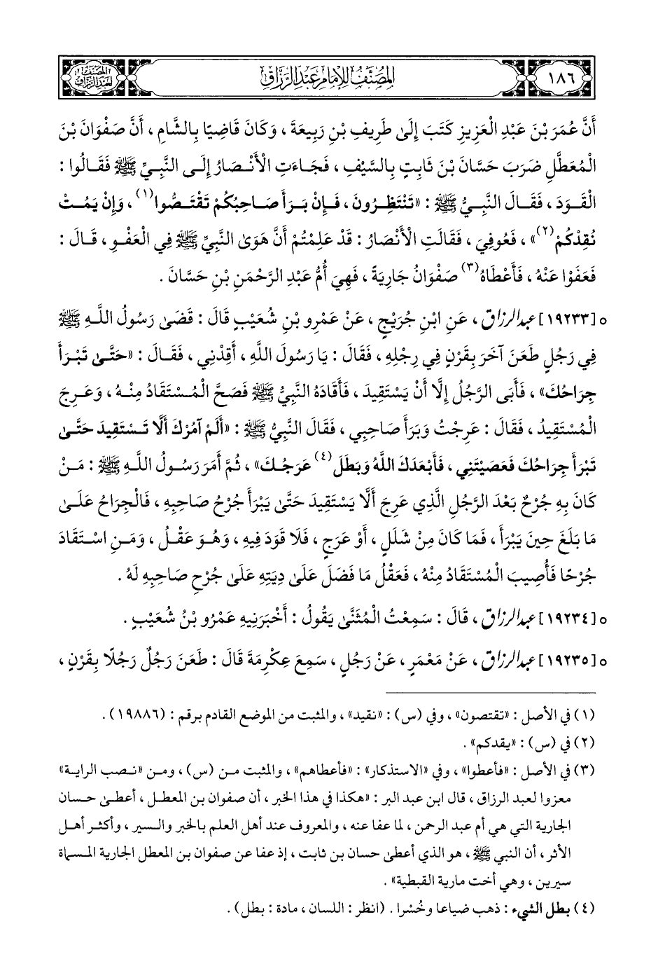 أَنَّ عُمَرَ بْنَ عَبْدِ الْعَزِيزِ كَتَبَ إِلَى طَرِيفِ بْنِ رَبِيعَةَ، وَكَانَ قَاضِيًا بِالشَّامِ، أَنَّ صَفْوَانَ بْنَ الْمُعَطَّلِ ضرَبَ حَسَّانَ بْنَ ثَابِتٍ بِالسَّيْفِ، فَجَاءَتِ الْأَنْصَارُ إِلَى النَّبِيِّ - صلى الله عليه وسلم - فَقَالُوا: الْقَوَدَ، فَقَالَ النَّبِيُّ - صلى الله عليه وسلم -:" تَنْتَظِرُونَ، فَإِنْ بَرَأَ صَاحِبُكُمْ تَقْتَصُّوا (¬١)، وَإِنْ يَمُتْ نُقِدْكُمْ (¬٢) "، فَعُوفِيَ، فَقَالَتِ الْأَنْصَارُ: قَدْ عَلِمْتُمْ أَنَّ هَوَى النَّبِيِّ - صلى الله عليه وسلم - في الْعَفْوِ، قَالَ: فَعَفَوْا عَنْه، فَأَعْطَاهُ (¬٣) صَفْوَانُ جَارِيَةً، فَهِيَ أُمُّ عَبْدِ الرَّحْمَنِ بْنِ حَسَّانَ.