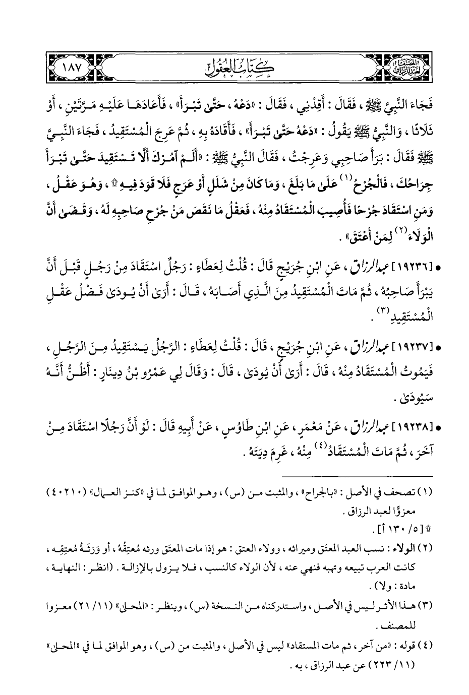 • [١٩٢٣٦] عبد الرزاق، عَنِ ابْنِ جُرَيْجٍ قَالَ: قُلْتُ لِعَطَاءٍ: رَجُلٌ اسْتَقَادَ مِنْ رَجُلٍ قَبْلَ أَنَّ يَبْرَأَ صَاحِبُه، ثُمَّ مَاتَ الْمُسْتَقِيدُ مِنَ الَّذِي أَصَابَه، قَالَ: أَرَى أَنْ يُودَى فَضلُ عَقْلِ الْمُسْتَقِيدِ (¬٣).