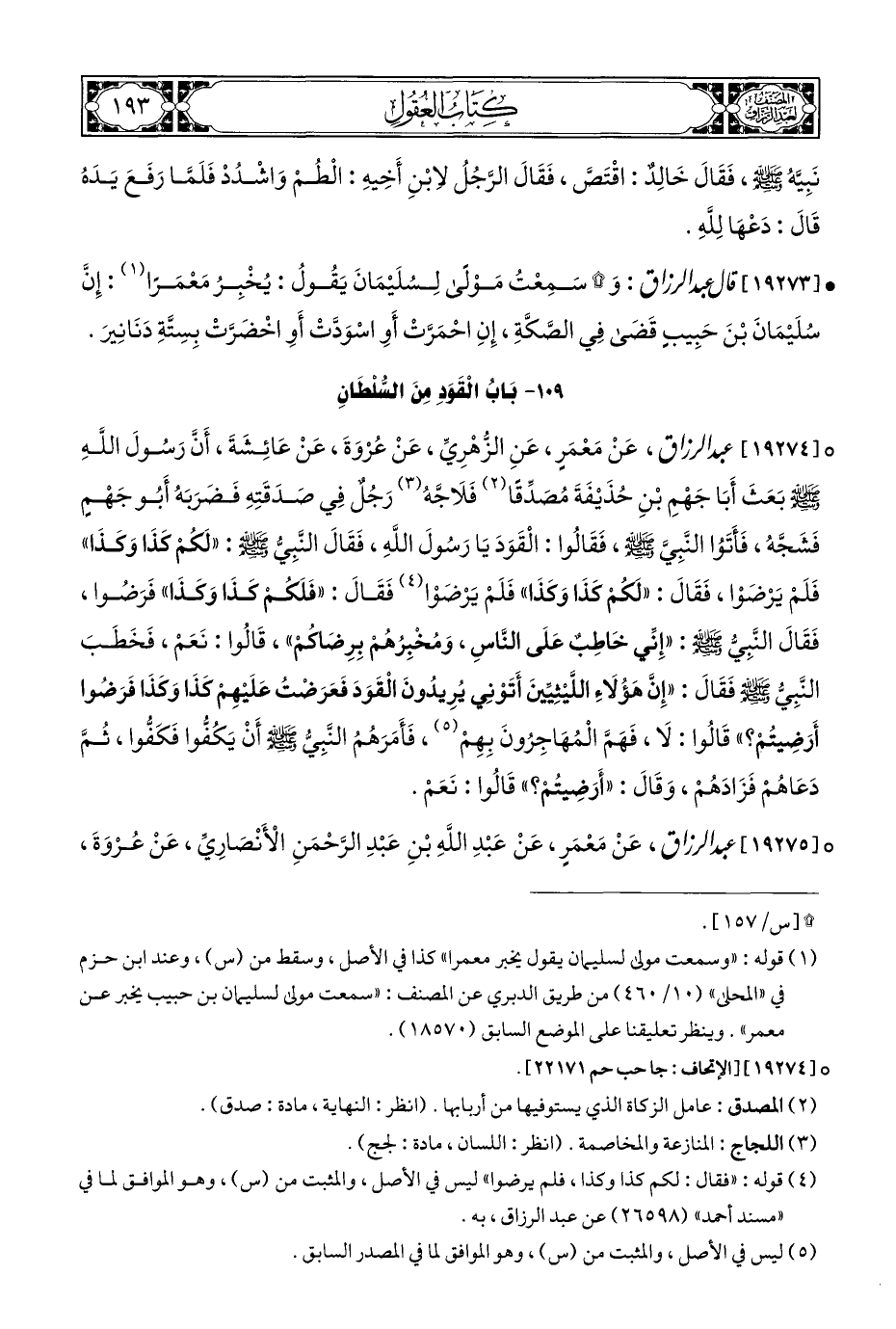 ° [١٩٢٧٤] عبد الرزاق، عَنْ مَعْمَرٍ، عَنِ الزُّهْرِيِّ، عَنْ عُرْوَةَ، عَنْ عَائِشَةَ، أَنَّ رَسُولَ اللَّهِ - صلى الله عليه وسلم - بَعَثَ أَبَا جَهْمِ بْنِ حُذَيْفَةَ مُصَدِّقًا (¬٢) فَلَاجَّهُ (¬٣) رَجُلٌ فِي صَدَقَتِهِ فَضَرَبَهُ أَبُو جَهْمٍ فَشَجَّه، فَأَتَوُا النَّبِيَّ - صلى الله عليه وسلم -، فَقَالُوا: الْقَوَدَ يَا رَسُولَ اللَّهِ، فَقَالَ النَّبِيُّ - صلى الله عليه وسلم -: "لَكُمْ كَذَا وَكَذَا" فَلَمْ يَرْضَوْا، فَقَالَ: "لكُمْ كَذَا وَكَذَا" فَلَمْ يَرْضَوْا (¬٤) فَقَالَ: "فَلَكُمْ كَذَا وَكَذَا" فَرَضُوا، فَقَالَ النَّبِيُّ - صلى الله عليه وسلم -: "إِني خَاطِبٌ عَلَى النَّاسِ، وَمُخْبِرُهُمْ بِرِضَاكمْ"، قَالُوا: نَعَمْ، فَخَطَبَ النَّبِيُّ - صلى الله عليه وسلم - فقَالَ: "إِنَّ هَؤُلَاءِ اللَّيْثِيِّينَ أَتَوْنِي يُرِيدُونَ الْقَوَدَ فَعَرَضْتُ عَلَيْهِمْ كَذَا وَكَذَا فَرَضُوا أَرَضِيتُمْ؟ " قَالُوا: لَا، فَهَمَّ الْمُهَاجِرُونَ بِهِمْ (¬٥)، فَأَمَرَهُمُ النَّبِيُّ - صلى الله عليه وسلم - أنْ يَكُفُّوا فَكَفُّوا، ثُمَّ دَعَاهُمْ فَزَادَهُمْ، وَقَالَ: "أَرَضِيتُمْ؟ " قَالُوا: نَعَمْ.