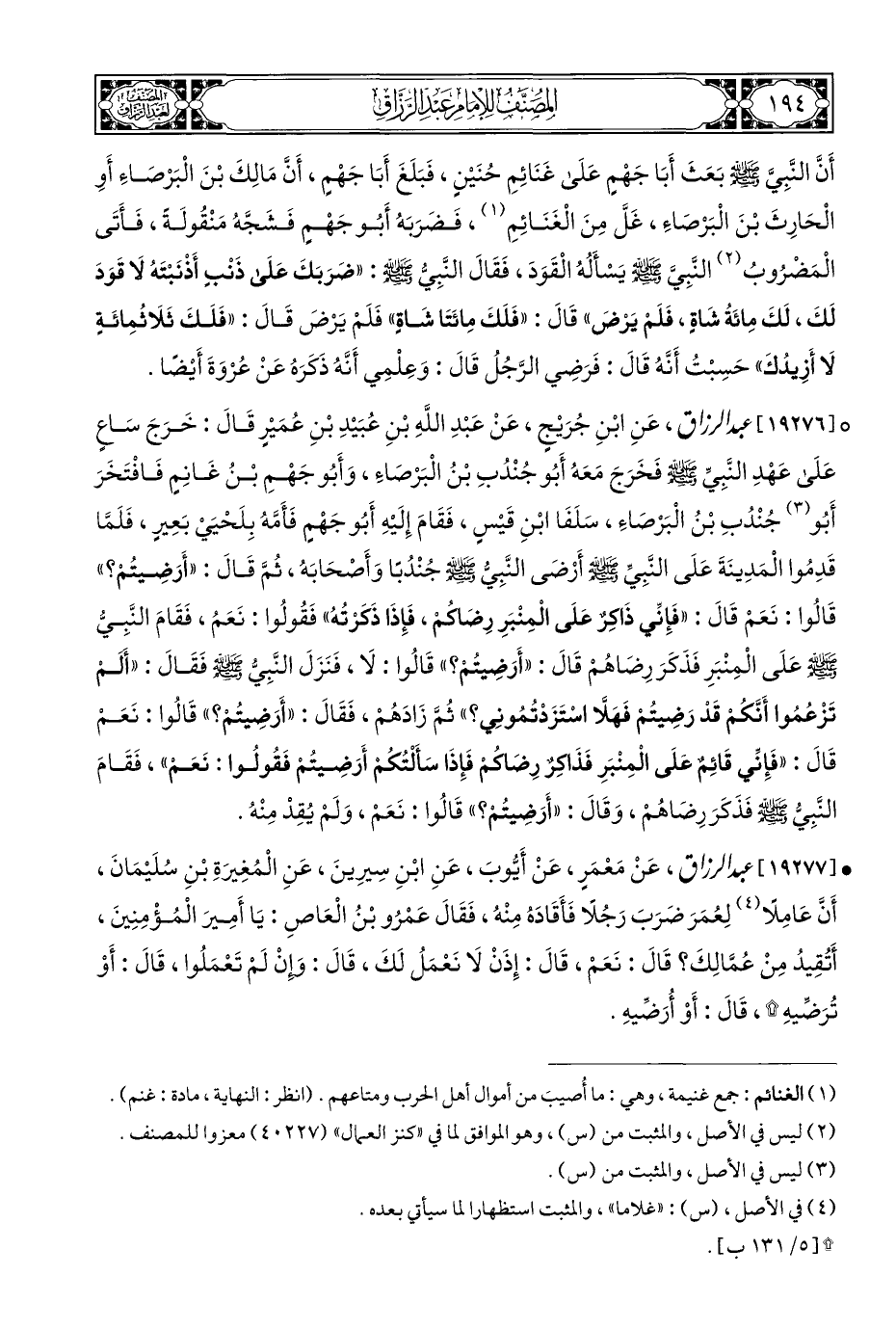 ° [١٩٢٧٦] عبد الرزاق، عَنِ ابْنِ جُرَيْجٍ، عَنْ عَبْدِ اللَّهِ بْنِ عُبَيْدِ بْنِ عُمَيْرٍ قَالَ: خَرَجَ سَاعٍ عَلَى عَهْدِ النَّبِيِّ - صلى الله عليه وسلم - فخَرَجَ مَعَهُ أَبُو جُنْدُبِ بْنُ الْبَرْصَاءِ، وَأَبُو جَهْمِ بْنُ غَانِمٍ فَافْتَخَرَ أَبُو (¬٣) جُنْدُبِ بْنُ الْبَرْصَاءِ، لسَلَفَا ابْنِ قَيْسٍ، فَقَامَ إِلَيْهِ أَبُو جَهْمٍ فَأَمَّهُ بِلَحْيَي بَعِيرٍ، فَلَمَّا قَدِمُوا الْمَدِينَةَ عَلَى النَّبِيِّ - صلى الله عليه وسلم - أَرْضَى النَّبِيُّ - صلى الله عليه وسلم - جُنْدُبًا وَأَصْحَابَه، ثُمَّ قَالَ: "أَرَضِيتُمْ؟ " قَالُوا: نَعَمْ قَالَ: "فَإِنِّي ذَاكِرٌ عَلَى الْمِنْبَرِ رِضَاكمْ، فَإِذَا ذَكَرْتُهُ " فَقُولُوا: نَعَم، فَقَامَ النَّبِيُّ - صلى الله عليه وسلم - عَلَى الْمِنْبَرِ فَذَكَرَ رِضَاهُمْ قَالَ: "أَرَضِيتُمْ؟ " قَالُوا: لَا، فَنَزَلَ النَّبِيُّ - صلى الله عليه وسلم - فَقَالَ: "ألَمْ تَزْعُمُوا أَنَّكُمْ قَدْ رَضِيتُمْ فَهَلَّا اسْتَزَدْتُمُونِي؟ " ثُمَّ زَادَهُمْ، فَقَالَ: "أَرَضِيتُمْ؟ " قَالُوا: نَعَمْ قَالَ: "فَإِنِّي قَائِمٌ عَلَى الْمِنْبَرِ فَذَاكِرٌ رِضَاكُمْ فَإِذَا سَألتُكُمْ أَرَضِيتُمْ فَقُولُوا: نَعَمْ"، فَقَامَ النَّبِيُّ - صلى الله عليه وسلم - فذَكَرَ رِضَاهُمْ، وَقَالَ: "أَرَضِيتُمْ؟ " قَالُوا: نَعَمْ، وَلَمْ يُقِدْ مِنْهُ.