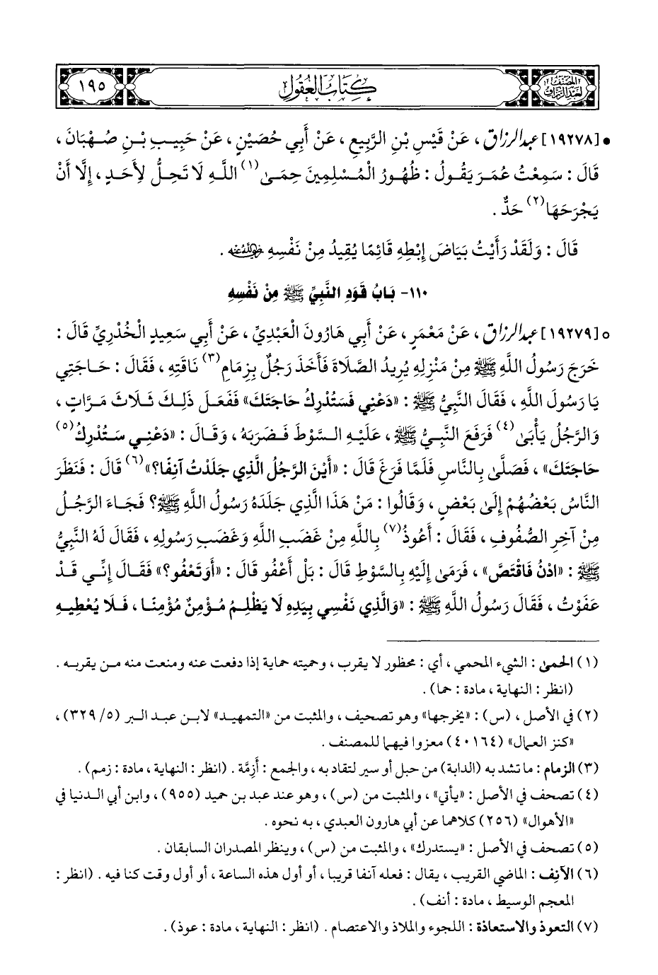 ° [١٩٢٧٩] عبد الرزاق، عَنْ مَعْمَرٍ، عَنْ أَبِي هَارُونَ الْعَبْدِيِّ، عَنْ أَبِي سَعِيدٍ الْخُدْرِيِّ قَالَ: خَرَجَ رَسُولُ اللَّهِ - صلى الله عليه وسلم - مِنْ مَنْزِلِهِ يُرِيدُ الصَّلَاةَ فَأَخَذَ رَجُلٌ بِزِمَامِ (¬٣) نَاقَتِهِ، فَقَالَ: حَاجَتِي يَا رَسُولَ اللَّهِ، فَقَالَ النَّبِيُّ - صلى الله عليه وسلم -:" دَعْنِي فَسَتُدْرِكُ حَاجَتَكَ" فَفَعَلَ ذَلِكَ ثَلَاثَ مَرَّاتٍ، وَالرَّجُلُ يَأْبَى (¬٤) فَرَفَعَ النَّبِيُّ - صلى الله عليه وسلم -، عَلَيْهِ السَّوْطَ فَضَرَبَه، وَقَالَ: "دَعْنِي سَتُدْرِكُ (¬٥) حَاجَتَكَ"، فَصَلَّى بِالنَّاسِ فَلَمَّا فَرَغَ قَالَ: "أَيْنَ الرَّجُلُ الَّذِي جَلَدْتُ آنِفًا؟ " (¬٦) قَالَ: فَنَظَرَ النُّاسُ بَعْضُهُمْ إِلَى بَعْضٍ، وَقَالُوا: مَنْ هَذَا الَّذِي جَلَدَهُ رَسُولُ اللَّهِ - صلى الله عليه وسلم -؟ فَجَاءَ الرَّجُلُ مِنْ آخِرِ الصُّفُوفِ، فَقَالَ: أَعُوذُ (¬٧) بِاللهِ مِنْ غَضَبِ اللَّهِ وَغَضَبِ رَسُولِهِ، فَقَالَ لَهُ النَّبِيُّ - صلى الله عليه وسلم -: "ادْنُ فَاقْتَصَّ"، فَرَمَى إِلَيْهِ بِالسَّوْطِ قَالَ: بَلْ أَعْفُو قَالَ: "أَوَتَعْفُو؟ " فَقَالَ إِنِّي قَدْ عَفَوْت، فَقَالَ رَسُولُ اللَّهِ - صلى الله عليه وسلم -:" وَالَّذِي نَفْسِي بِيَدِهِ لَا يَظْلِمُ مُؤْمِنٌ مُؤْمِنًا، فَلَا يُعْطِيهِ