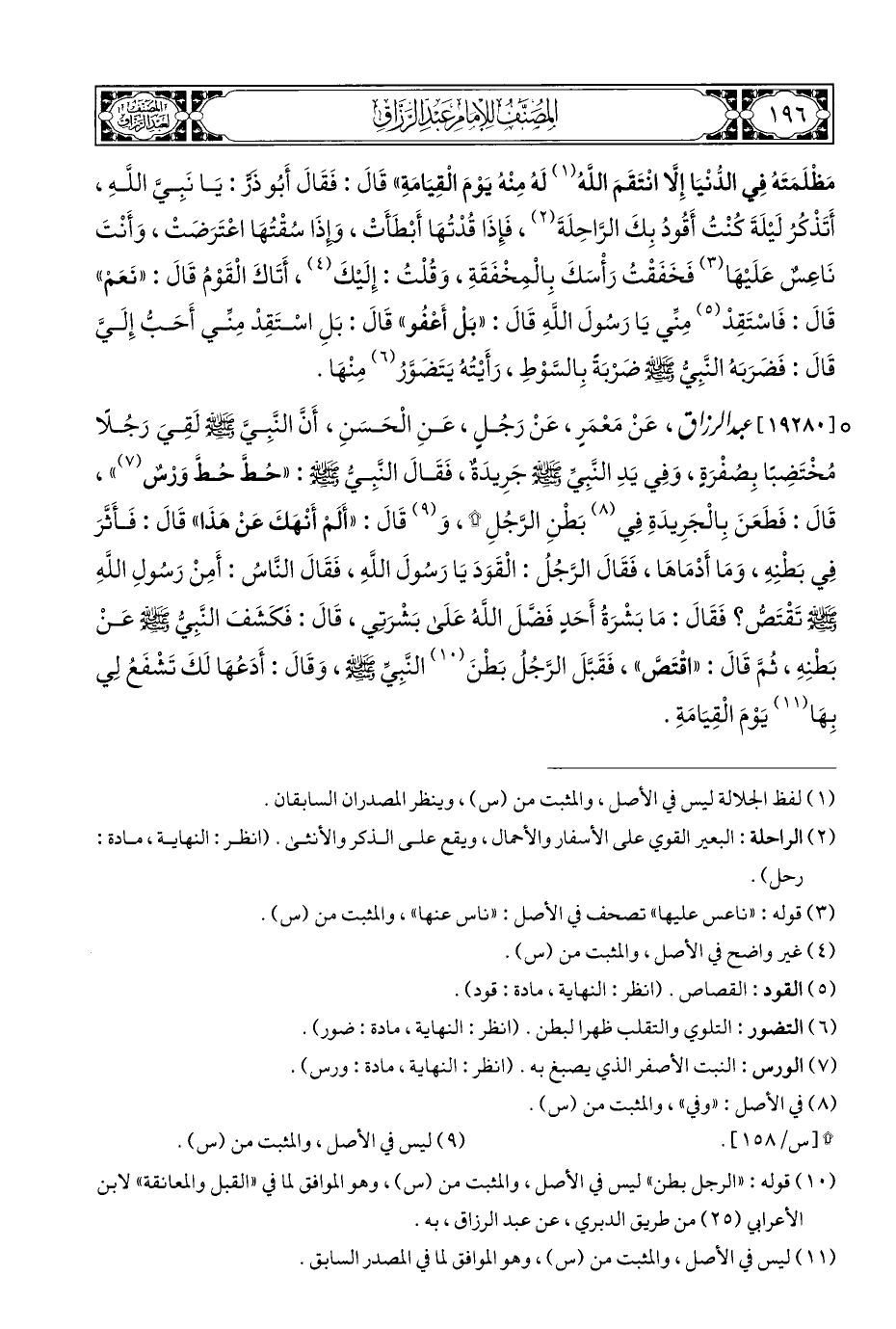 ° [١٩٢٨٠] عبد الرزاق، عَنْ مَعْمَرٍ، عَنْ رَجُلٍ، عَنِ الْحَسَنِ، أَنَّ النَّبِيَّ - صلى الله عليه وسلم - لَقِيَ رَجُلًا مُخْتَضِبًا بِصفْرَةٍ، وَفِي يَدِ النَّبِيِّ - صلى الله عليه وسلم - جَرِيدَةٌ، فَقَالَ النبِيُّ - صلى الله عليه وسلم -: "حُطَّ حُطَّ وَرْسٌ (¬٧) "، قَالَ: فَطَعَنَ بِالْجَرِيدَةِ فِي (¬٨) بَطْنِ الرَّجُلِ *، وَ (¬٩) قَالَ: "أَلَمْ أَنْهَكَ عَنْ هَذَا" قَالَ: فَأَثَّرَ فِي بَطْنِهِ، وَمَا أَدْمَاهَا، فَقَالَ الرَّجُلُ: الْقَوَدَ يَا رَسُولَ اللَّهِ، فَقَالَ النَّاسُ: أَمِنْ رَسُولِ اللهِ - صلى الله عليه وسلم - تَقْتَصُّ؟ فَقَالَ: مَا بَشْرَةُ أَحَدٍ فَضَّلَ اللَّهُ عَلَى بَشْرَتِي، قَالَ: فَكَشَفَ النَّبِيُّ - صلى الله عليه وسلم - عَنْ بَطْنِهِ، ثُمَّ قَالَ: "اقْتَصَّ"، فَقَبَّلَ الرَّجُلُ بَطْنَ (¬١٠) النَّبِيِّ - صلى الله عليه وسلم -، وَقَالَ: أَدَعُهَا لَكَ تَشْفَعُ لِي بِهَا (¬١١) يَوْمَ القِيَامَةِ.
