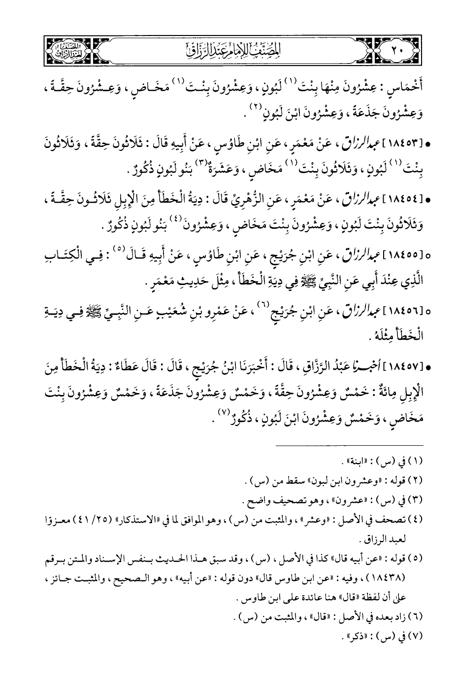 ° [١٨٤٥٥] عَبْدُ الرَّزَّاقِ، عَنِ ابْنِ جُرَيْجٍ، عَنِ ابْنِ طَاوُسٍ، عَنْ أَبِيهِ قَالَ (¬٥): فِي الْكِتَابِ الَّذِي عَنْدَ أَبِي عَنِ النَّبِيِّ - صلى الله عليه وسلم - فِي دِيَةِ الْخَطَأَ، مِثْلَ حَدِيثِ مَعْمَرٍ.