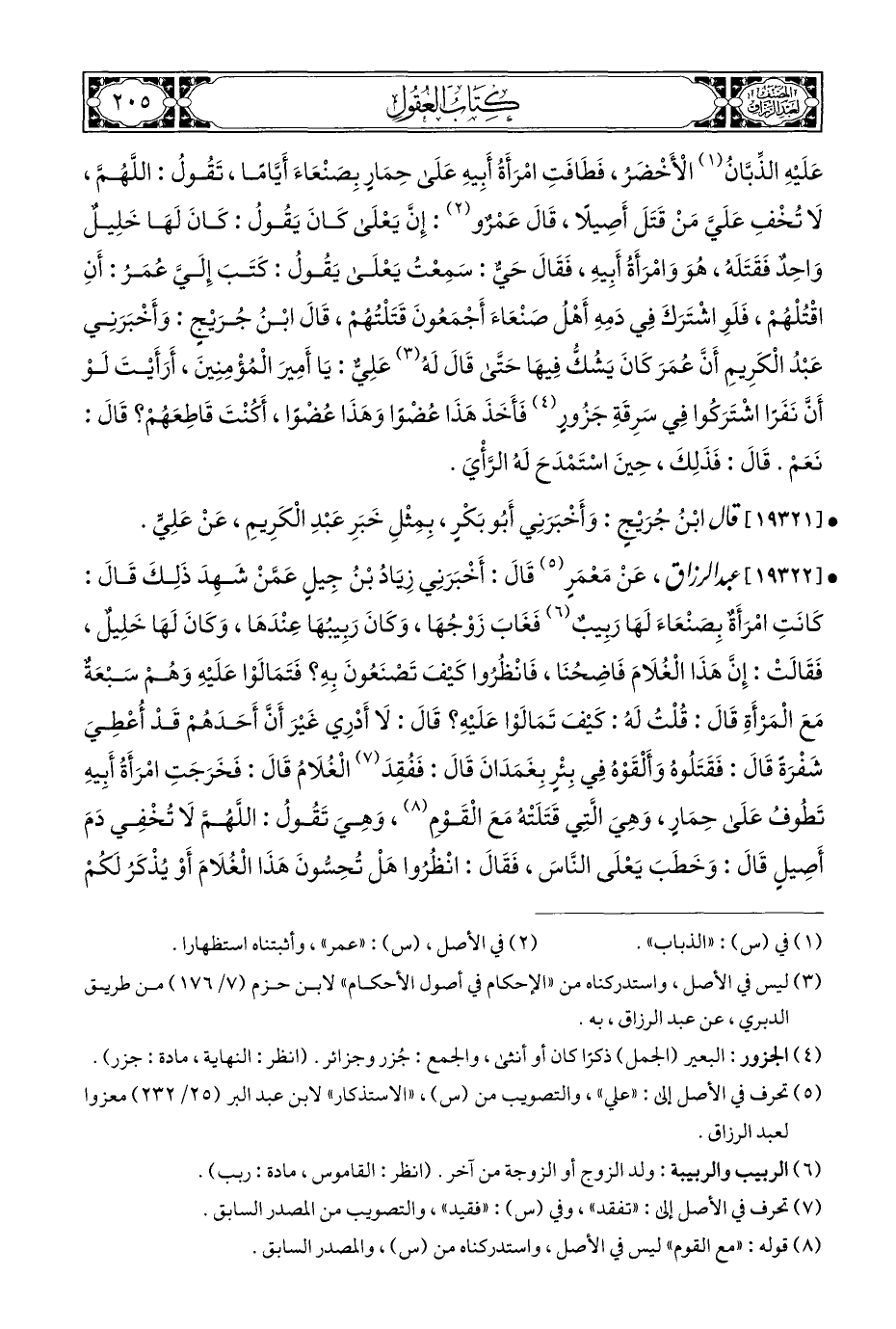 • [١٩٣٢٢] عبد الرزاق، عَنْ مَعْمَرٍ (¬٥) قَالَ: أَخْبَرَنِي زِيَادُ بْنُ جِيلٍ عَمَّنْ شَهِدَ ذَلِكَ قَالَ: كَانَتِ امْرَأَةٌ بِصَنْعَاءَ لَهَا رَبِيبٌ (¬٦) فَغَابَ زَوْجُهَا، وَكَانَ رَبِيبُهَا عِنْدَهَا، وَكَانَ لَهَا خَلِيلٌ، فَقَالَتْ: إِنَّ هَذَا الْغُلَامَ فَاضِحُنَا، فَانْظُرُوا كَيْفَ تَصْنَعُونَ بِهِ؟ فَتَمَالَوْا عَلَيْهِ وَهُمْ سَبْعَةٌ مَعَ الْمَرْأَةِ قَالَ: قُلْتُ لَهُ: كَيْفَ تَمَالَوْا عَلَيْهِ؟ قَالَ: لَا أَدْرِي غَيْرَ أَنَّ أَحَدَهُمْ قَدْ أُعْطِيَ شَفْرَةً قَالَ: فَقَتَلُوهُ وَأَلْقَوْهُ فِي بِئْرٍ بِغَمَدَانَ قَالَ: فَفُقِدَ (¬٧) الْغُلَامُ قَالَ: فَخَرَجَتِ امْرَأَةُ أَبِيهِ تَطُوفُ عَلَى حِمَارٍ، وَهِيَ الَّتِي قَتَلَتْهُ مَعَ الْقَوْمِ (¬٨)، وَهِيَ تَقُولُ: اللَّهُمَّ لَا تُخْفِي دَمَ أَصِيلٍ قَالَ: وَخَطَبَ يَعْلَى النَّاسَ، فَقَالَ: انْظُرُوا هَلْ تُحِسُّونَ هَذَا الْغُلَامَ أَوْ يُذْكَرُ لكمْ