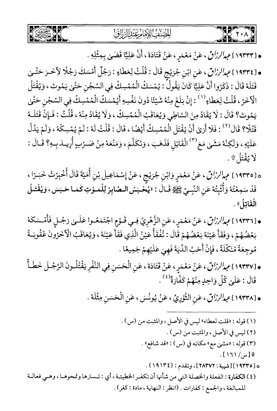 • [١٩٣٣٧] عبد الرزاق، عَنْ مَعْمَرٍ، عَنْ قَتَادَةَ، عَنِ الْحَسَنِ فِي النَّفْرِ يَقْتُلُونَ الرَّجُلَ خَطَأً قَالَ: عَلَى كُلِّ وَاحِدٍ مِنْهُمْ كَفَّارَةٌ (¬٤).
