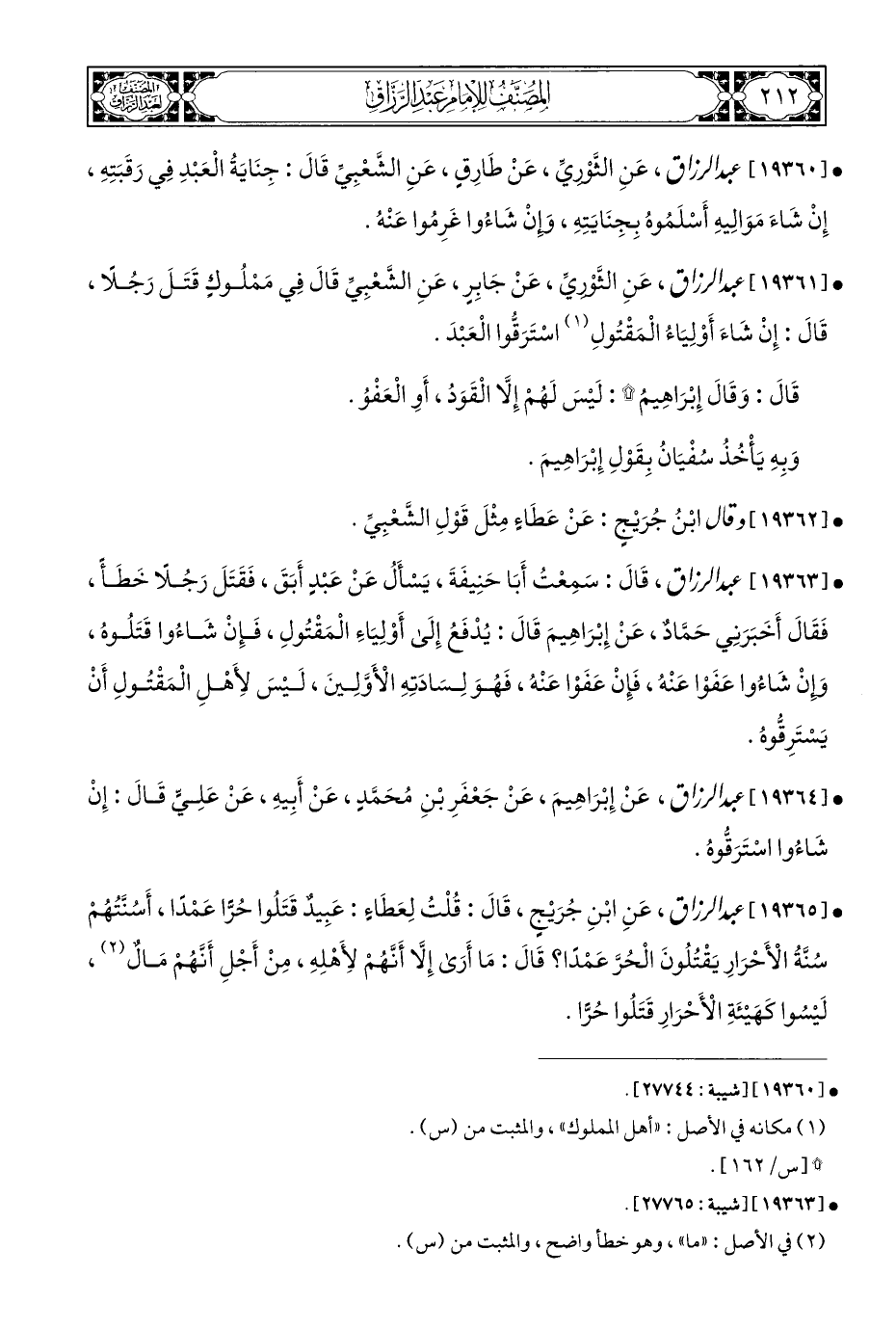 • [١٩٣٦٥] عبد الرزاق، عَنِ ابْنِ جُرَيْجٍ، قَالَ: قُلْتُ لِعَطَاءٍ: عَبِيدٌ قَتَلُوا حُرًّا عَمْدًا، أَسُنَّتُهُمْ سُنَّةُ الْأَحْرَارِ يَقْتُلُونَ الْحُرَّ عَمْدًا؟ قَالَ: مَا أَرَى إِلَّا أَنَّهُمْ لِأَهْلِهِ، مِنْ أَجْلِ أَنَّهُمْ مَالٌ (¬٢)، لَيْسُوا كَهَيْئَةِ الْأَحْرَارِ قَتَلُوا حُرًّا.