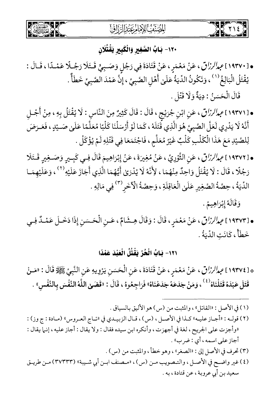 ° [١٩٣٧٤] عبد الرزاق، عَنْ مَعْمَرٍ، عَنْ قَتَادَةَ، عَنِ الْحَسَنِ يَرْويهِ عَنِ النَّبِيِّ - صلى الله عليه وسلم - قَالَ: "مَنْ قَتَلَ عَبْدَهُ قَتَلْنَاهُ (¬٤)، وَمَنْ جَدَعَهُ جَدَعْنَاهُ" فَرَاجِعُوه، قَالَ: "قَضَى اللَّهُ النَّفْسَ بِالنَّفْسِ".