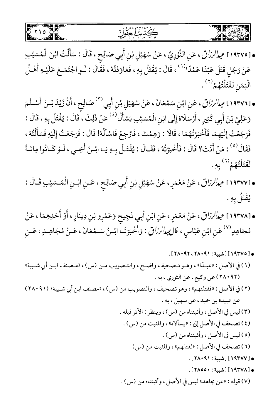 • [١٩٣٧٦] عبد الرزاق، عَنِ ابْنِ سَمْعَانَ، عَنْ سُهَيْلِ بْنِ أَبِي (¬٣) صالِحٍ، أَنَّ زَيْدَ بْنَ أَسْلَمَ وَعَلِيَّ بْنَ أَبِي كَثِيرٍ، أَرْسَلَاهُ إِلَى ابْنِ الْمُسَيَّبِ يَسْأَلُ (¬٤) عَنْ ذَلِكَ، قَالَ: يُقْتَلُ بِهِ، قَالَ: فَرَجَعْتُ إِلَيْهِمَا فَأَخْبَرْتُهُمَا، قَالَا: وَهِمْتَ، فَارْجِعْ فَاسْأَلْهُ! قَالَ: فَرَجَعْتُ إِلَيْهِ فَسَأَلْتُه، فَقَالَ (¬٥): مَنْ أَنْتَ؟ قَالَ: فَأَخْبَرْتُه، فَقَالَ: يُقْتَلُ بِهِ يَا ابْنَ أَخِي، لَوْ كَانُوا مِائَةً لَقَتَلْتُهُمْ (¬٦) بِهِ.
