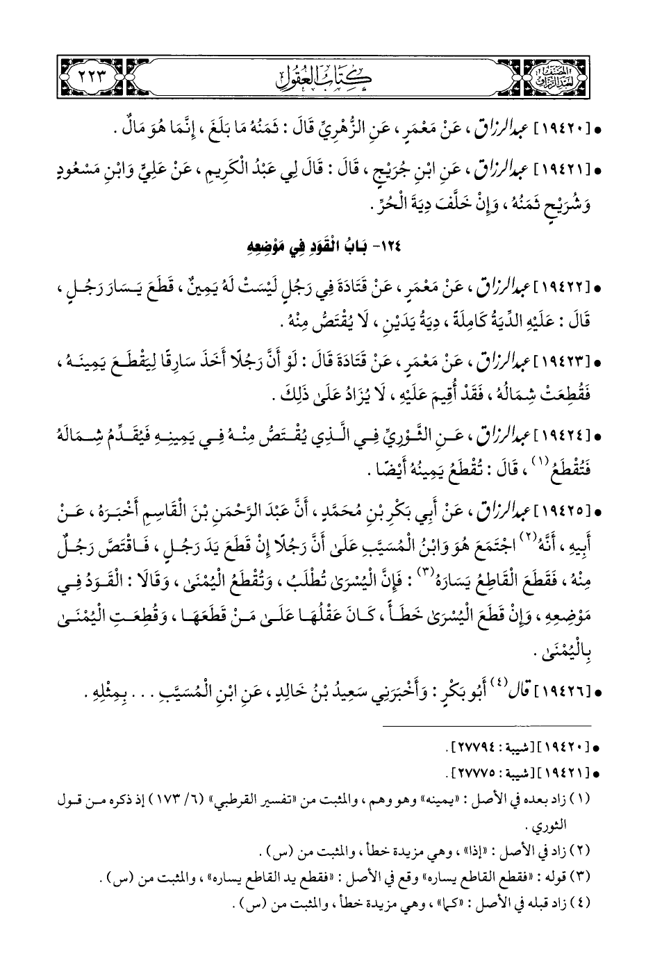 • [١٩٤٢٥] عبد الرزاق، عَنْ أَبِي بَكْرِ بْنِ مُحَمَّدٍ، أَنَّ عَبْدَ الرَّحْمَنِ بْنَ الْقَاسِمِ أَخْبَرَه، عَنْ أَبِيهِ، أَنَّهُ (¬٢) اجْتَمَعَ هُوَ وَابْنُ الْمُسَيَّبِ عَلَى أَنَّ رَجُلًا إِنْ قَطَعَ يَدَ رَجُلٍ، فَاقْتَصَّ رَجُلٌ مِنْه، فَقَطَعَ الْقَاطِعُ يَسَارَهُ (¬٣): فَإِنَّ الْيُسْرَى تُطْلَب، وَتُقْطَعُ الْيُمْنَى، وَقَالَا: الْقَوَدُ فِي مَوْضِعِهِ، وإِنْ قَطَعَ الْيُسْرَى خَطَأً، كَانَ عَقْلُهَا عَلَى مَنْ قَطَعَهَا، وَقُطِعَتِ الْيُمْنَى بِالْيُمْنَى.