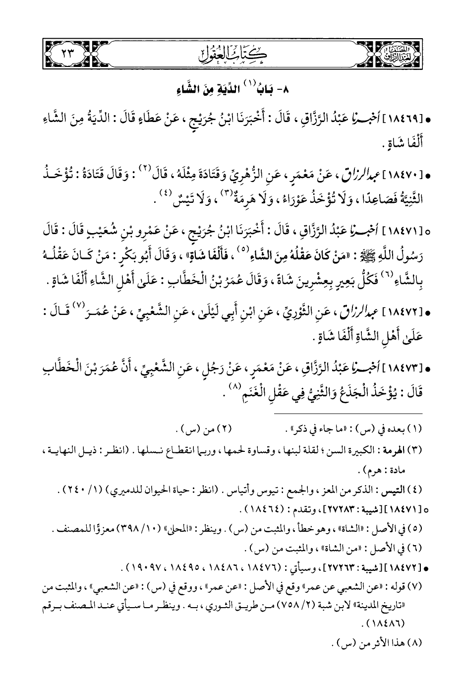 • [١٨٤٧٢] عَبْدُ الرَّزَّاقِ، عَنِ الثَّوْرِيِّ، عَنِ ابْنِ أَبِي لَيْلَى، عَنِ الشَّعْبِيِّ، عَنْ عُمَرَ (¬٧) قَالَ: عَلَى أَهْلِ الشَّاةِ أَلْفًا شَاةٍ.