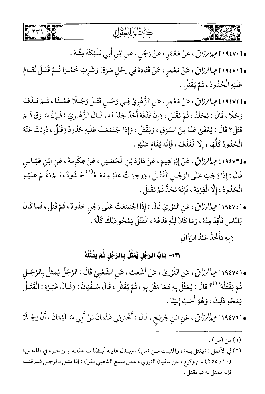 • [١٩٤٧٥] عبد الرزاق، عَنِ الثَّوْرِيِّ، عَنْ أَشْعَثَ، عَنِ الشَّعْبِيِّ قَالَ: الرَّجُلُ يُمَثِّلُ بِالرَّجُلِ ثُمَّ يَقْتُلُهُ (¬٢)؟ قَالَ: يُمَثَّلُ بِهِ كَمَا مَثَّلَ بِهِ، ثُمَّ يُقْتَل، قَالَ سُفْيَانُ: وَقَالَ غَيْرُهُ: الْقَتْلُ يَمْحُو ذَلِكَ، وَهُوَ أَحَبُّ إِلَيْنَا.