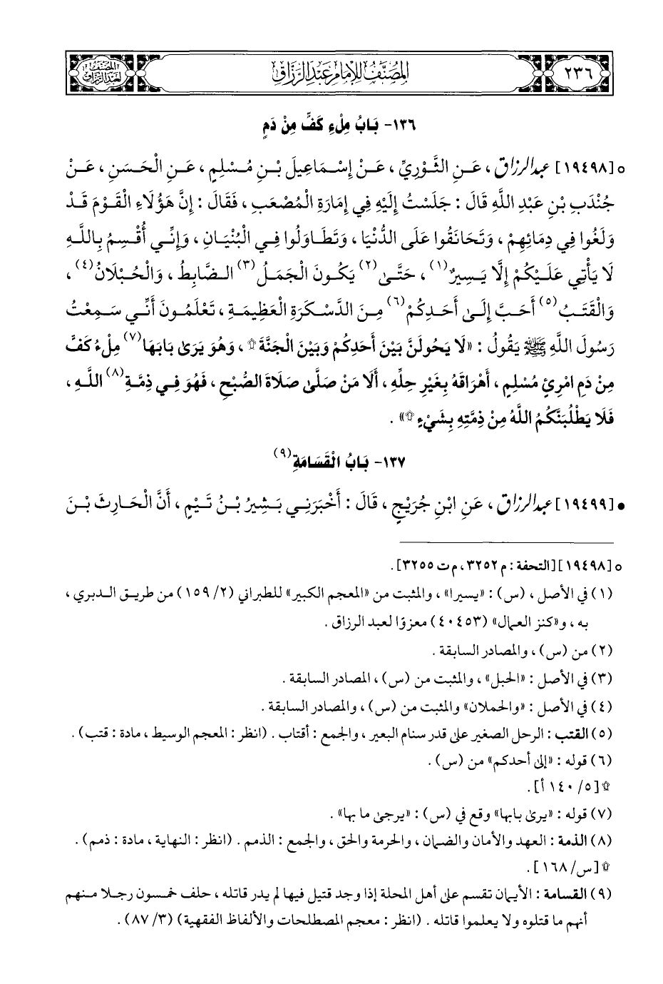 (¬٩) القسامة: الأيمان تقسم على أهل المحلة إذا وجد قتيل فيها لم يدر قاتله، حلف خمسون رجلا منهم أنهم ما قتلوه ولا يعلموا قاتله. (انظر: معجم المصطلحات والألفاظ الفقهية) (٣/ ٨٧).