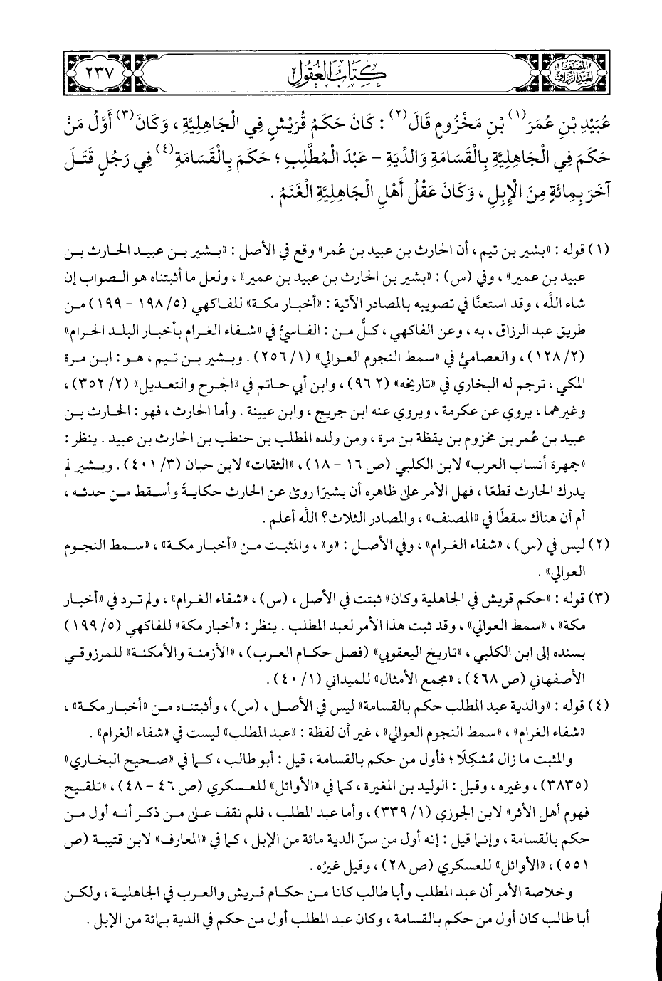 عُبَيْدِ بْنِ عُمَرَ (¬١) بْنِ مَخْزُومٍ قَالَ (¬٢): كَانَ حَكَمُ قُرَيْشٍ فِي الْجَاهِلِيَّةِ، وَكَانَ (¬٣) أَوَّلُ مَنْ حَكَمَ فِي الْجَاهِلِيَّةِ بِالْقَسَامَةِ وَالدِّيَةِ - عَبْدَ الْمُطَّلِبِ؛ حَكَمَ بِالْقَسَامَةِ (¬٤) فِي رَجُلٍ قَتَلَ آخَرَ بِمِائَةٍ مِنَ الْإِبِلِ، وَكَانَ عَقْلُ أَهْلِ الْجَاهِلِيَّةِ الْغَنَمُ.