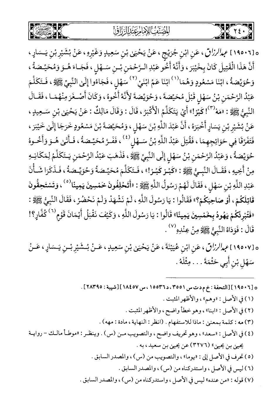 ° [١٩٥٠٦] عبد الرزاق، عَنِ ابْنِ جُرَيْجٍ، عَنْ يَحْيَى بْنِ سَعِيدٍ وَغَيْرِهِ، عَنْ بُشَيْرِ بْنِ يَسَارٍ، أَنَّ هَذَا الْقَتِيلَ كَانَ بِخَيْبَرَ، وَأَنَّهُ أَخُو عَبْدِ الرَّحْمَنِ بْنِ سَهْلٍ، فَجَاءَ هُوَ وَمُحَيِّصَةُ، وَحُوَيِّصَة، ابْنَا مَسْعُودٍ وَهُمَا (¬١) ابْنَا عَمِّ ابْنَيْ (¬٢) سَهْلٍ، فَجَاءُوا إِلَى النَّبِيِّ - صلى الله عليه وسلم -، فَتَكَلَّمَ عَبْدُ الرَّحْمَنِ بْنُ سَهْلٍ قَبْلَ مُحَيِّصَةَ، وَحُوَيِّصَةَ لِأَنَّهُ أَخُوه، وَكَانَ أَصْغَرَ مِنْهُمَا، فَقَالَ النَّبِيُّ - صلى الله عليه وسلم -: "مَهْ (¬٣)! كَبِّرْ! " أَيْ يَتَكَلَّمُ الْأَكْبَر، قَالَ: وَقَالَ مَالِكٌ: عَنْ يَحْيَى بْنِ سَعِيدٍ، عَنْ بُشَيْرِ بْنِ يَسَارٍ أَخْبَرَه، أَنَّ عَبْدَ اللَّهِ بْنَ سَهْلٍ، وَمُحَيِّصَةَ بْنَ مَسْعُودٍ خَرَجَا إِلَى خَيْبَرَ، فَتَفَرَّقَا فِي حَوَائِجِهِمَا، فَقُتِلَ عَبْدُ اللهِ بْنُ سَهْلٍ (¬٤)، فَفَرَّ مُحَيِّصَةُ، فَأَتَى هُوَ وَأَخُوهُ حُوَيِّصَة، وَعَبْدُ الرَّحْمَنِ بْنُ سَهْلِ إِلَى النَّبِيِّ - صلى الله عليه وسلم -، فَذَهَبَ عَبْدُ الرَّحْمَنِ يَتَكَلَّمُ لِمَكَانِهِ مِنْ أَخِيهِ، فَقَالَ النَّبِيُّ - صلى الله عليه وسلم -: "كَبِّرْ كَبِّرْ! "، فَتَكَلَّمَ مُحَيِّصةُ وَحُوَيِّصَة، فَذَكَرَا شَأْنَ عَبْدِ اللَّهِ بْنِ سَهْلٍ، فَقَالَ لَهُمْ رَسُولُ اللَّهِ - صلى الله عليه وسلم -: "أَتَحْلِفُونَ خَمْسِينَ يَمِينًا (¬٥)، وَتَسْتَحِقُّونَ قَاتِلَكُمْ، أَوْ صَاحِبَكُمْ؟ " فَقَالُوا: يَا رَسُولَ اللَّهِ، لَمْ نَشْهَدْ وَلَمْ نَحْضُرْ، فَقَالَ النَّبِيُّ - صلى الله عليه وسلم -: "فَتُبْرِئُكُمْ يَهُودُ بِخَمْسِينَ يَمِينًا" قَالُوا: يَا رَسُولَ اللَّهِ، وَكَيْفَ نَقْبَلُ أَيْمَانَ قَوْمٍ (¬٦) كُفَّارٍ؟! قَالَ: فَوَدَاهُ النَّبِيُّ - صلى الله عليه وسلم - مِنْ عِنْدِهِ (¬٧).