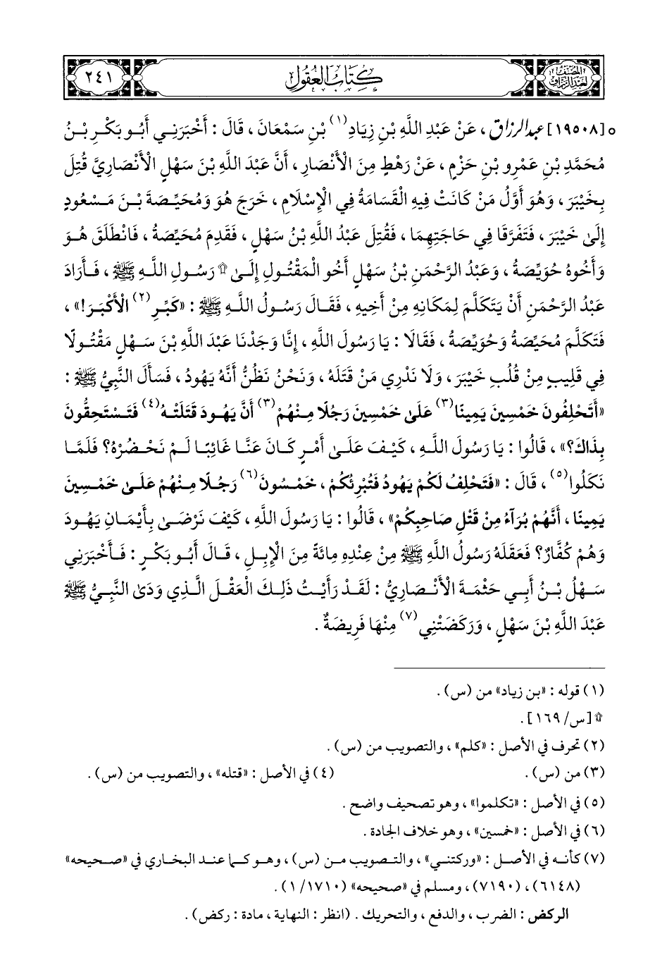 ° [١٩٥٠٨] عبد الرزاق، عَنْ عَبْدِ اللَّهِ بْنِ زِيَادِ (¬١) بْنِ سَمْعَانَ، قَالَ: أَخْبَرَنِي أَبُو بَكْرِ بْنُ مُحَمَّدِ بْنِ عَمْرِو بْنِ حَزْمٍ، عَنْ رَهْطٍ مِنَ الْأَنْصَارِ، أَنَّ عَبْدَ اللَّهِ بْنَ سَهْلٍ الْأَنْصَارِيَّ قُتِلَ بِخَيْبَرَ، وَهُوَ أَوَّلُ مَنْ كَانَتْ فِيهِ الْقَسَامَةُ فِي الْإِسْلَامِ، خَرَجَ هُوَ وَمُحَيِّصَةَ بْنَ مَسْعُودٍ إِلَى خَيْبَرَ، فَتَفَرَّقَا فِي حَاجَتِهِمَا، فَقُتِلَ عَبْدُ اللَّهِ بْنُ سَهْلٍ، فَقَدِمَ مُحَيِّصَة، فَانْطَلَقَ هُوَ وَأَخُوهُ حُوَيِّصَة، وَعَبْدُ الرَّحْمَنِ بْنُ سَهْلٍ أَخُو الْمَقْتُولِ إِلَى * رَسُولِ اللَّهِ - صلى الله عليه وسلم -، فَأَرَادَ عَبْدُ الرَّحْمَنِ أَنْ يَتَكَلَّمَ لِمَكَانِهِ مِنْ أَخِيهِ، فَقَالَ رَسُولُ اللَّهِ - صلى الله عليه وسلم -: "كَبِّرِ (¬٢) الْأَكْبَرَ! "، فَتَكَلَّمَ مُحَيِّصَةُ وَحُوَيِّصَةٌ، فَقَالَا: يَا رَسُولَ اللَّهِ، إِنَّا وَجَدْنَا عَبْدَ اللَّهِ بْنَ سَهْلٍ مَقْتُولًا فِي قَلِيبٍ مِنْ قُلُبِ خَيْبَرَ، وَلَا نَدْرِي مَنْ قَتَلَه، وَنَحْنُ نَظُنُّ أَنَّهُ يَهُود، فَسَأَلَ النَّبِيُّ - صلى الله عليه وسلم -: "أَتَحْلِفُونَ خَمْسِينَ يَمِينًا (¬٣) عَلَى خَمْسِينَ رَجُلًا مِنْهُمْ (¬٣) أَنَّ يَهُودَ قَتَلَتْهُ (¬٤) فَتَسْتَحِقُّونَ بِذَاكَ؟ "، قَالُوا: يَا رَسُولَ اللَّهِ، كَيْفَ عَلَى أَمْرٍ كَانَ عَنَّا غَائِبًا لَمْ نَحْضُرْهُ؟ فَلَمَّا نَكَلُوا (¬٥)، قَالَ: "فَتَحْلِفُ لَكُمْ يَهُودُ فَتُبْرِئُكُمْ، خَمْسُونَ (¬٦) رَجُلًا مِنْهُمْ عَلَى خَمْسِينَ يَمِينًا، أَنَّهُمْ بُرَآءُ مِنْ قَتْلِ صَاحِبِكُمْ"، قَالُوا: يَا رَسُولَ اللَّهِ، كَيْفَ نَرْضَى بِأَيْمَانِ يَهُودَ وَهُمْ كُفَّارٌ؟ فَعَقَلَهُ رَسُولُ اللَّهِ - صلى الله عليه وسلم - مِنْ عِنْدِهِ مِائَةً مِنَ الْإِبِلِ، قَالَ أَبُو بَكْرٍ: فَأَخْبَرَنِي سَهْلُ بْنُ أَبِي حَثْمَةَ الْأَنْصَارِيُّ: لَقَدْ رَأَيْتُ ذَلِكَ الْعَقْلَ الَّذِي وَدَى النَّبِيُّ - صلى الله عليه وسلم - عَبْدَ اللَّهِ بْنَ سَهْلٍ، وَرَكَضَتْنِي (¬٧) مِنْهَا فَرِيضَةٌ.
