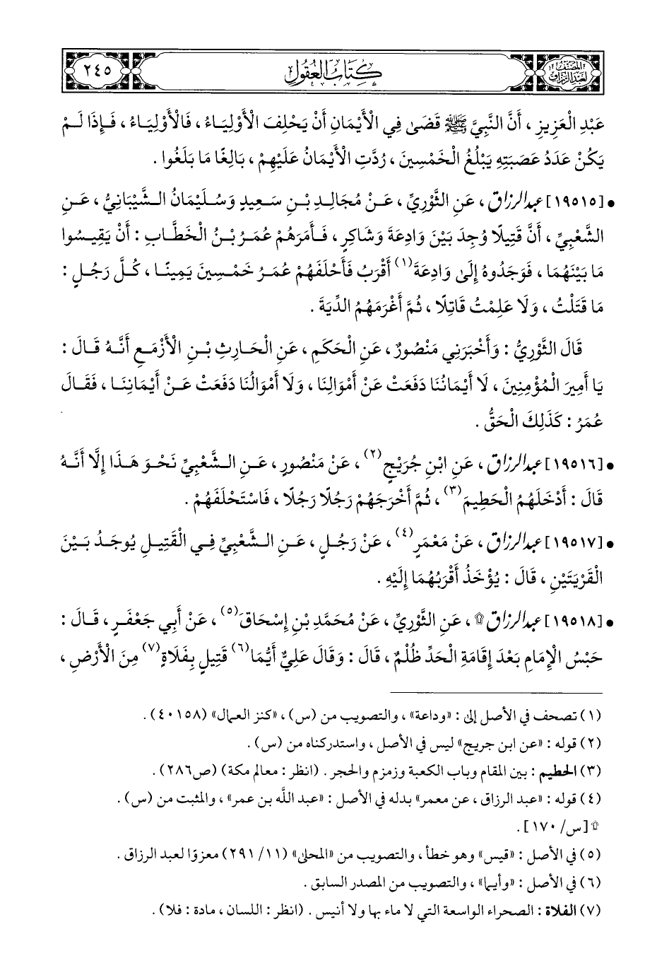 • [١٩٥١٦] عبد الرزاق، عَنِ ابْنِ جُرَيْجٍ (¬٢)، عَنْ مَنْصُورٍ، عَنِ الشَّعْبِيِّ نَحْوَ هَذَا إِلَّا أَنَّهُ قَالَ: أَدْخَلَهُمُ الْحَطِيمَ (¬٣)، ثُمَّ أَخْرَجَهُمْ رَجُلًا رَجُلًا، فَاسْتَحْلَفَهُمْ.