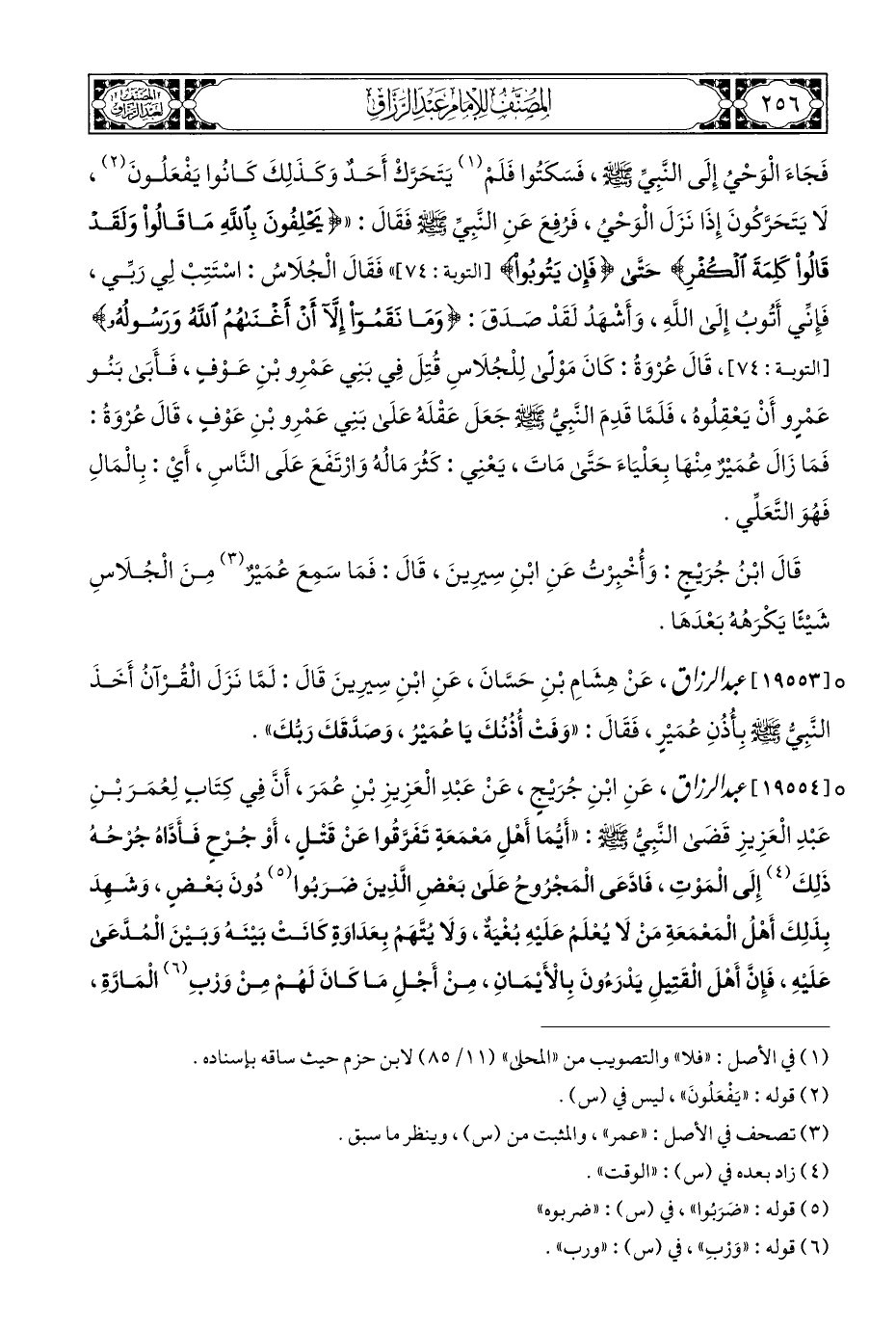 ° [١٩٥٥٣] عبد الرزاق، عَنْ هِشَامِ بْنِ حَسَّانَ، عَنِ ابْنِ سِيرِينَ قَالَ: لَمَّا نَزَلَ الْقُرْآنُ أَخَذَ النَّبِيُّ - صلى الله عليه وسلم - بِأُذُنِ عُمَيْرٍ، فَقَالَ: "وَفَتْ أُذُنُكَ يَا عُمَيْر، وَصَدَّقَكَ رَبُّكَ".