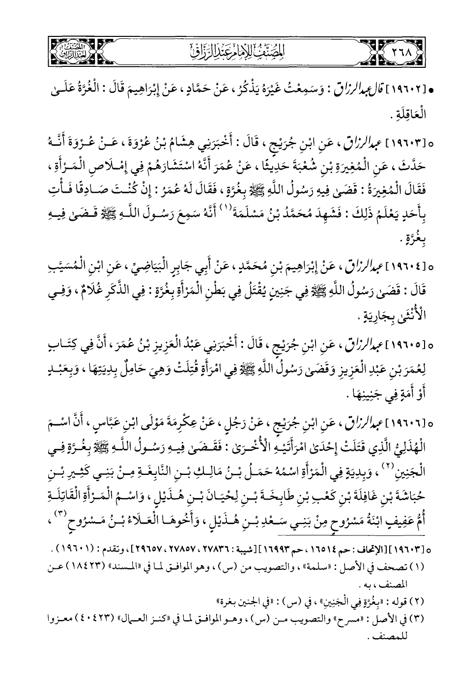 ° [١٩٦٠٣] عبد الرزاق، عَنِ ابْنِ جُرَيْجٍ، قَالَ: أَخْبَرَنِي هِشَامُ بْنُ عُرْوَةَ، عَنْ عُرْوَةَ أَنَّهُ حَدَّثَ، عَنِ الْمُغِيرَةِ بْنِ شُعْبَةَ حَدِيثًا، عَنْ عُمَرَ أَنَّهُ اسْتَشَارَهُمْ فِي إِمْلَاصِ الْمَرْأَةِ، فَقَالَ الْمُغِيرَةُ: قَضَى فِيهِ رَسُولُ اللَّهِ - صلى الله عليه وسلم - بِغُرَّةٍ، فَقَالَ لَهُ عُمَرُ: إِنْ كُنْتَ صَادِقًا فَأْتِ بِأَحَدٍ يَعْلَمُ ذَلِكَ: فَشَهِدَ مُحَمَّدُ بْنُ مَسْلَمَةَ (¬١) أَنَّهُ سَمِعَ رَسُولَ اللَّهِ - صلى الله عليه وسلم - قَضَى فِيهِ بِغُرَّةٍ.
