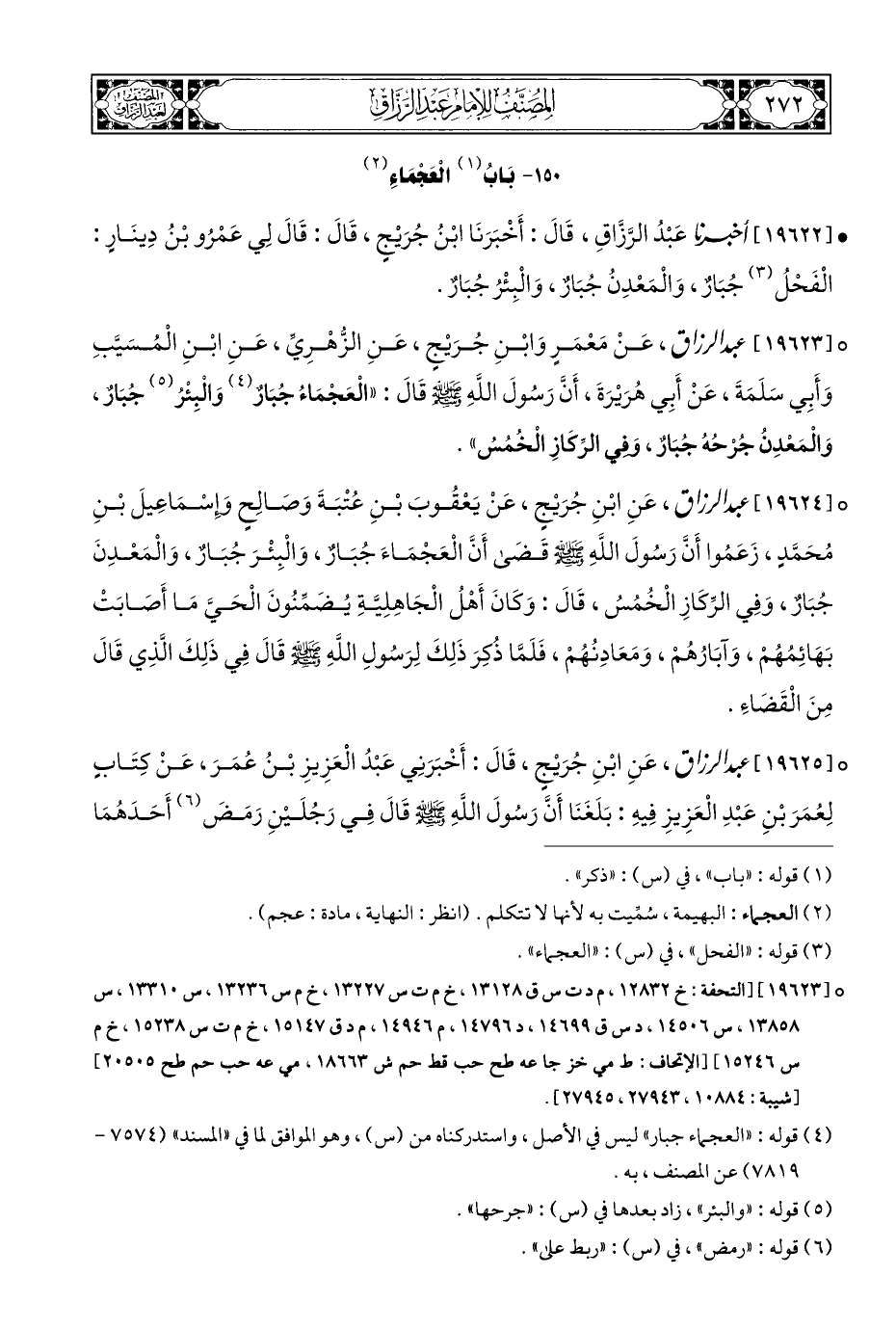 ° [١٩٦٢٣] عبد الرزاق، عَنْ مَعْمَرٍ وَابْنِ جُرَيْجٍ، عَنِ الزُّهْرِيِّ، عَنِ ابْنِ الْمُسَيَّبِ وَأَبِي سَلَمَةَ، عَنْ أَبِي هُرَيْرَةَ، أَنَّ رَسُولَ اللَّهِ - صلى الله عليه وسلم - قَالَ: "الْعَجْمَاءُ جُبَارٌ (¬٤) وَالْبِئْرُ (¬٥) جُبَارٌ، وَالْمَعْدِنُ جُرْحُهُ جُبَارٌ، وَفِي الرِّكَازِ الْخُمُسُ".