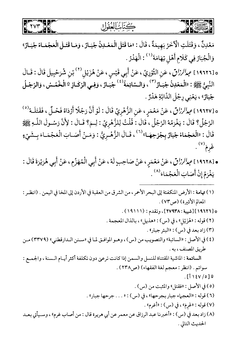 ° [١٩٦٢٦] عبد الرزاق، عَنِ الثَّوْرِيِّ، عَنْ أَبِي قَيْسٍ، عَنْ هُزَيْلِ (¬٢) بْنِ شُرَحْبِيلَ قَالَ: قَالَ النَّبِيُّ - صلى الله عليه وسلم -: "الْمَعْدِنُ جُبَارٌ (¬٣)، وَالسَّائِمَةُ (¬٤) جُبَارٌ، وَفِي الرَّكَازِ * الْخُمُس، وَالرَّجْلُ جُبَارٌ"، يَعْنِي رِجْلَ الدَّابَّةِ هَدْرٌ.