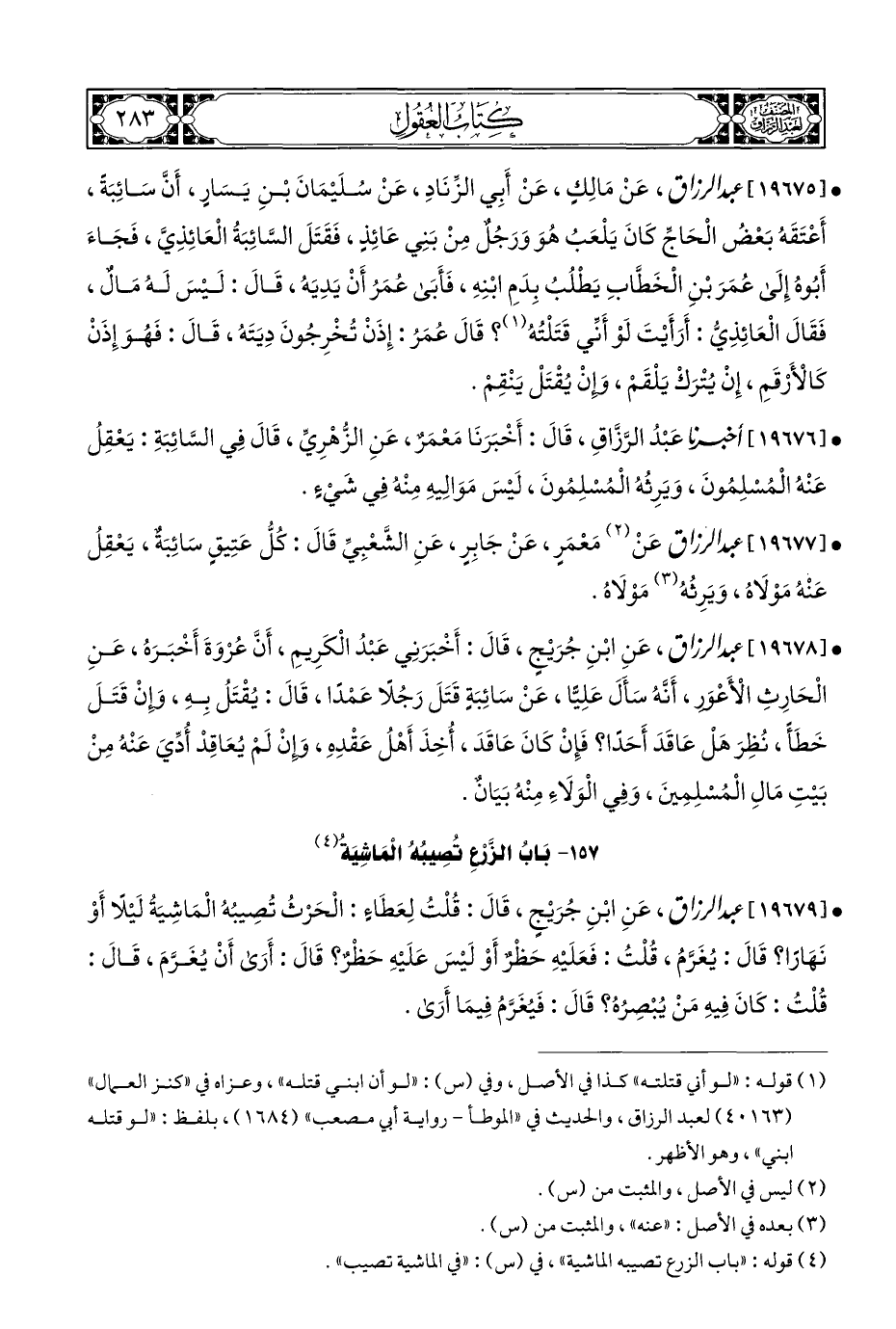 • [١٩٦٧٧] عبد الرزاق عَنْ (¬٢) مَعْمَرٍ، عَنْ جَابِرٍ، عَنِ الشَّعْبِيِّ قَالَ: كُلُّ عَتِيقٍ سَائِبَةٌ، يَعْقِلُ عَنْهُ مَوْلَاه، وَيَرِثُهُ (¬٣) مَوْلَاهُ.