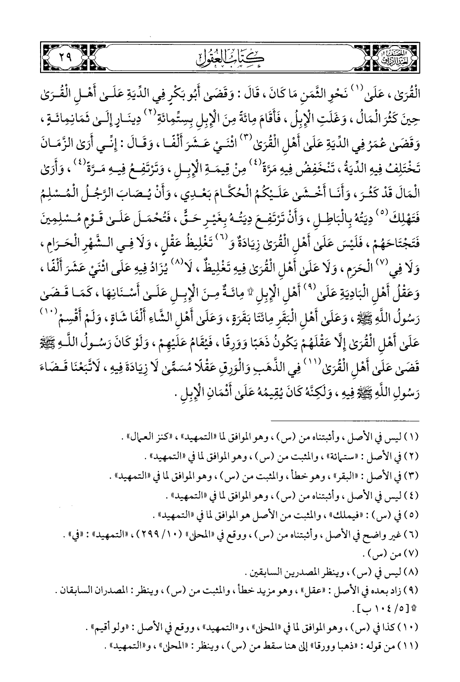 الْقُرَى، عَلَى (¬١) نَحْوِ الثَّمَنِ مَا كَانَ، قَالَ: وَقَضَى أَبُو بَكْرٍ فِي الدِّيَةِ عَلَى أَهْلِ الْقُرَى حِينَ كَثُرَ الْمَالُ، وَغَلَتِ الْإِبِلُ، فَأَقَامَ مِائَةً مِنَ الْإِبِلِ بسِتِّمِائَةِ (¬٢) دِينَارٍ إِلَى ثَمَانِمِائَةٍ، وَقَضَى عُمَرُ فِي الدِّيَةِ عَلَى أَهْلِ الْقُرَى (¬٣) اثْنَي عَشَرَ أَلْفًا، وَقَالَ: إِنِّي أَرَى الزَّمَانَ تَخْتَلِفُ فِيهِ الدِّيَةُ، تَنْخَفِضُ فِيهِ مَرَّةً (¬٤) مِنْ قِيمَةِ الْإِبِلِ، وَتَرْتَفِعُ فِيهِ مَرَّةً (¬٤)، وَأَرَى الْمَالَ قَدْ كَثُرَ، وَأَنَا أَخْشَى عَلَيْكُمُ الْحُكَّامَ بَعْدِي، وَأَنْ يُصابَ الرَّجُلُ الْمُسْلِمُ فَتَهْلِكَ (¬٥) دِيَتُهُ بِالْبَاطِلِ، وَأَنْ تَرْتَفِعَ دِيَتُهُ بِغَيْرِ حَقٍّ، فَتُحْمَلَ عَلَى قَوْمٍ مُسْلِمِينَ فَتَجْتَاحَهُمْ، فَلَيْسَ عَلَى أَهْلِ الْقُرَى زِيَادَةٌ وَ (¬٦) تَغْلِيظُ عَقْلٍ، وَلَا فِي الشَهْرِ الْحَرَامِ، وَلَا في (¬٧) الْحَرَمِ، وَلَا عَلَى أَهْلِ الْقُرَى فِيهِ تَغْلِيظٌ، لَا (¬٨) يُزَادُ فِيهِ عَلَى اثْنَي عَشَرَ أَلْفًا، وَعَقْلُ أَهْلِ الْبَادِيَةِ عَلَى (¬٩) أَهْلِ الْإِبِلِ * مِائَةٌ مِنَ الْإِبِلِ عَلَى أَسْنَانِهَا، كَمَا قَضَى رَسُولُ اللَّهِ - صلى الله عليه وسلم -، وَعَلَى أَهْلِ الْبَقَرِ مِائَتَا بَقَرَةٍ، وَعَلَى أَهْلِ الشَّاءَ أَلْفَا شَاةٍ، وَلَمْ أَقْسِمْ (¬١٠) عَلَى أَهْلِ الْقُرَى إِلَّا عَقْلَهُمْ يَكُونُ ذَهَبًا وَوَرِقًا، فَيُقَامُ عَلَيْهِمْ، وَلَوْ كَانَ رَسُولُ اللَّهِ - صلى الله عليه وسلم - قَضَى عَلَى أَهْلِ الْقُرَى (¬١١) فِي الذَّهَبِ وَالْوَرقِ عَقْلًا مُسَمًّى لَا زِيَادَةَ فِيهِ، لَاتَّبَعْنَا قَضَاءَ رَسُولِ اللهِ - صلى الله عليه وسلم - فِيهِ، وَلكنَّهُ كَانَ يُقِيمُهُ عَلَى أَثْمَانِ الْإِبِلِ.