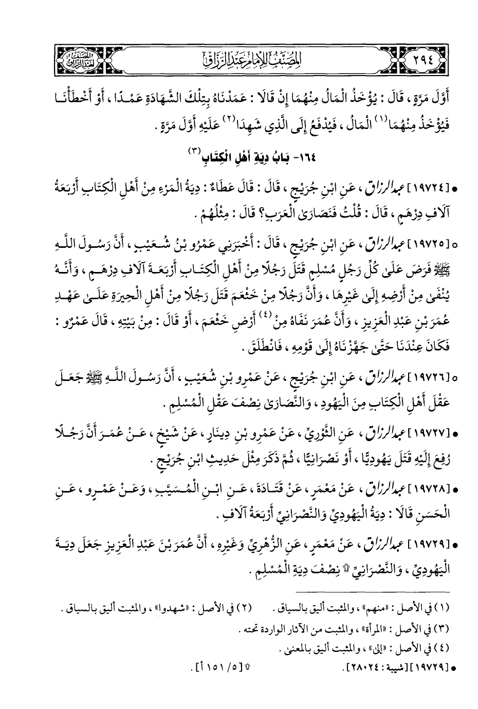 ° [١٩٧٢٦] عبد الرزاق، عَنِ ابْنِ جُرَيْجٍ، عَنْ عَمْرِو بْنِ شُعَيْبٍ، أَنَّ رَسُولَ اللَّهِ - صلى الله عليه وسلم - جَعَلَ عَقْلَ أَهْلِ الْكِتَابِ مِنَ الْيَهُودِ، وَالنَّصارَى نِصْفَ عَقْلِ الْمُسْلِمِ.