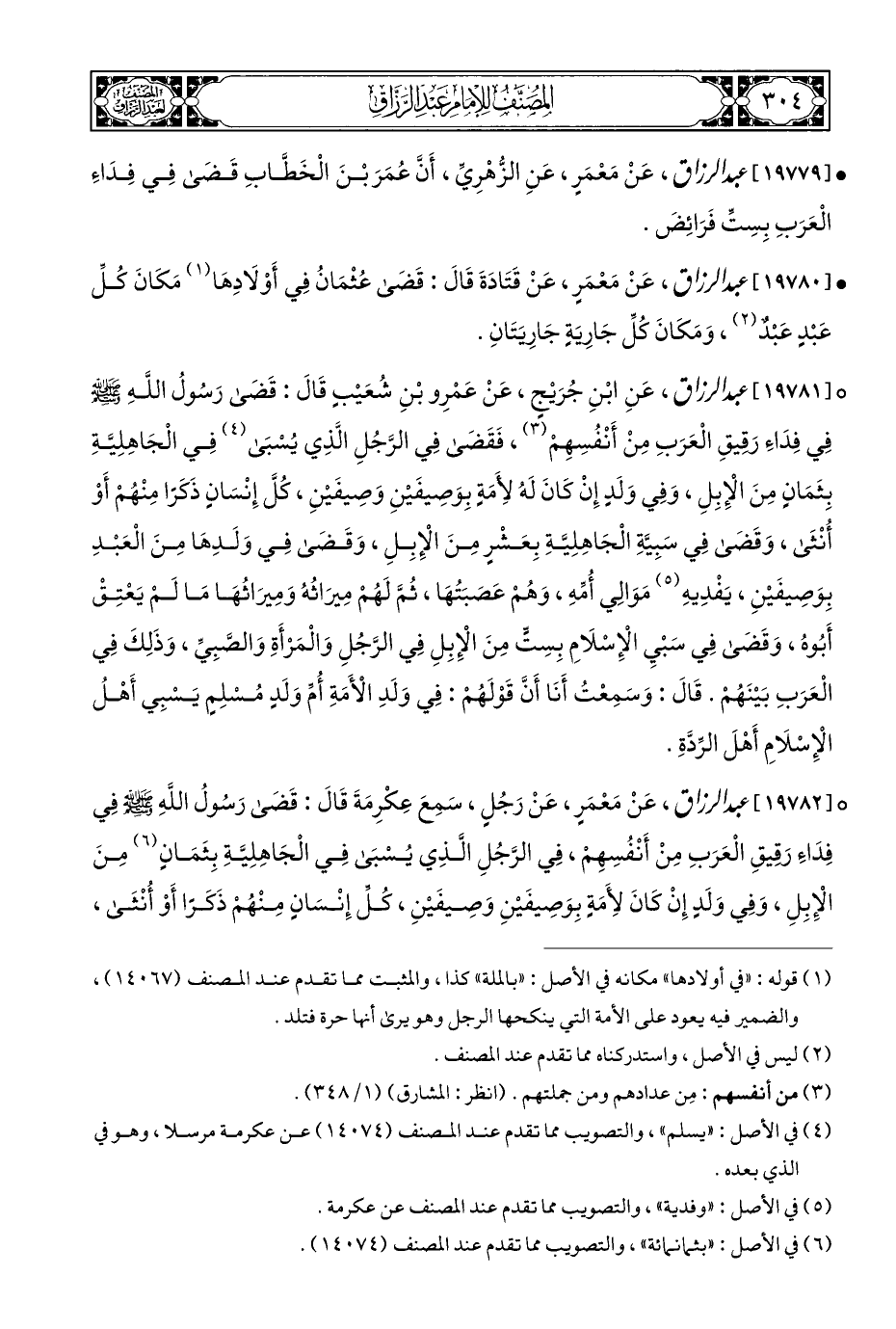 ° [١٩٧٨١] عبد الرزاق، عَنِ ابْنِ جُرَيْجٍ، عَنْ عَمْرِو بْنِ شُعَيْبٍ قَالَ: قَضَى رَسُولُ اللَّهِ - صلى الله عليه وسلم - فِي فِدَاءِ رَقيقِ الْعَرَبِ مِنْ أَنْفُسِهِمْ (¬٣)، فَقَضى فِي الرَّجُلِ الَّذِي يُسْبَى (¬٤) فِي الْجَاهِلِيَّةِ بِثَمَانٍ مِنَ الْإِبِلِ، وَفِي وَلَدٍ إِنْ كَانَ لَهُ لِأَمَةٍ بِوَصِيفَيْنِ وَصِيفَيْنِ، كُلَّ إِنْسَانِ ذَكَرًا مِنْهُمْ أَوْ أُنْثَى، وَقَضَى فِي سَبِيَّةِ الْجَاهِلِيَّةِ بِعَشْرٍ مِنَ الْإِبِلِ، وَقَضَى فِي وَلَدِهَا مِنَ الْعَبْدِ بِوَصِيفَيْنِ، يَفْدِيهِ (¬٥) مَوَالِي أُمِّهِ، وَهُمْ عَصَبَتُهَا، ثُمَّ لَهُمْ مِيرَاثُهُ وَمِيرَاثُهَا مَا لَمْ يَعْتِقْ أَبُوه، وَقَضَى فِي سَبْيِ الْإِسْلَامِ بِسِتٍّ مِنَ الْإِبِلِ فِي الرَّجُلِ وَالْمَرْأَةِ وَالصَّبِيِّ، وَذَلِكَ فِي الْعَرَبِ بَيْنَهُمْ. قَالَ: وَسَمِعْتُ أَنَا أَنَّ قَوْلَهُمْ: فِي وَلَدِ الْأَمَةِ أُمّ وَلَدٍ مُسْلِمٍ يَسْبِي أَهْلُ الْإِسْلَامِ أَهْلَ الرِّدَّةِ.