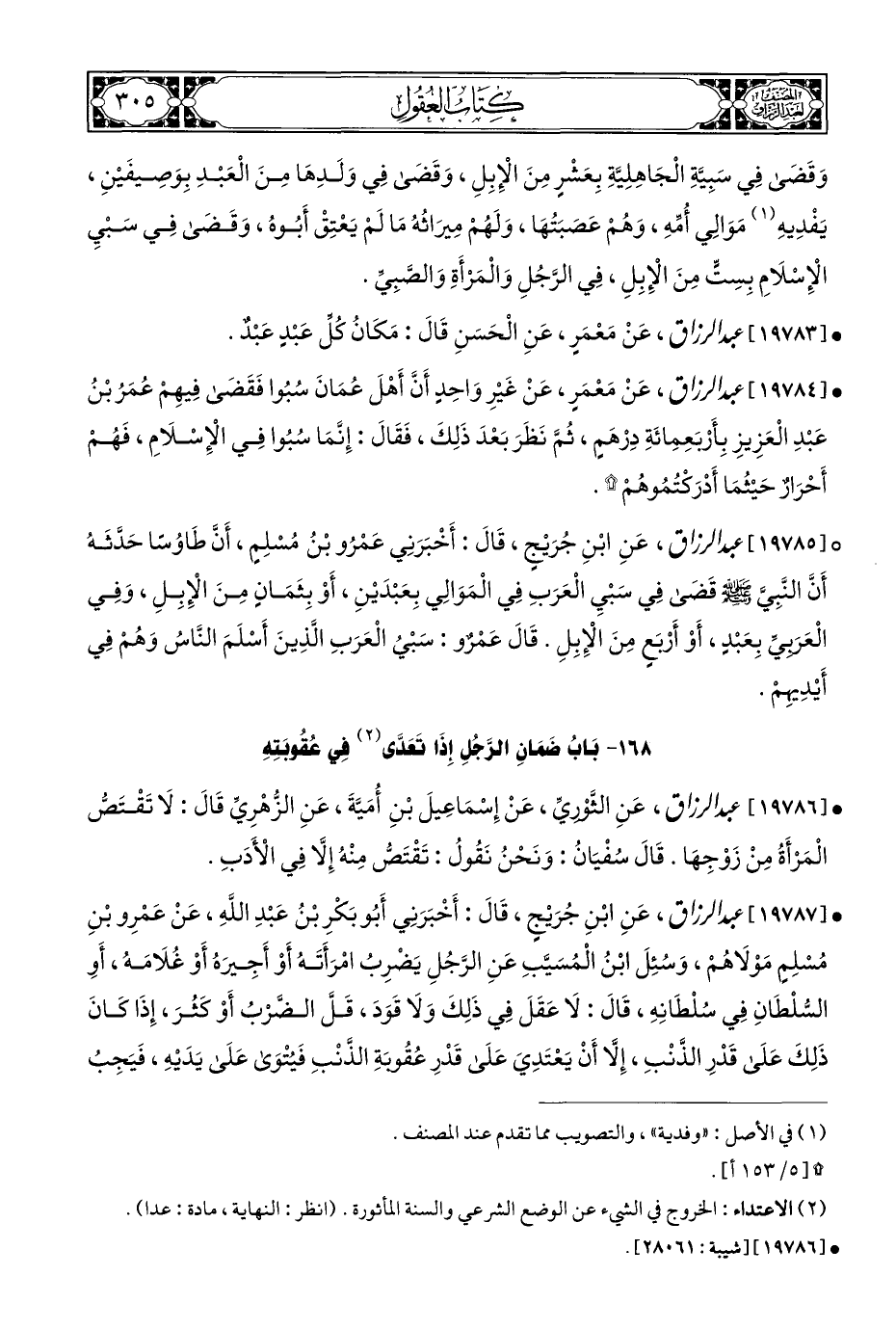 ° [١٩٧٨٥] عبد الرزاق، عَنِ ابْنِ جُرَيْجٍ، قَالَ: أَخْبَرَنِي عَمْرُو بْنُ مُسْلِمِ، أَنَّ طَاوُسًا حَدَّثَهُ أَنَّ النَّبِيَّ - صلى الله عليه وسلم - قَضَى فِي سَبْيِ الْعَرَبِ فِي الْمَوَالِي بِعَبْدَيْنِ، أَوْ بِثَمَانٍ مِنَ الْإِبِلِ، وَفِي الْعَرَبِيِّ بِعَبْدٍ، أَوْ أَرْبَعٍ مِنَ الْإِبِلِ. قَالَ عَمْرٌو: سَبْيُ الْعَرَبِ الَّذِينَ أَسْلَمَ النَّاسُ وَهُمْ فِي أَيْدِيهِمْ.