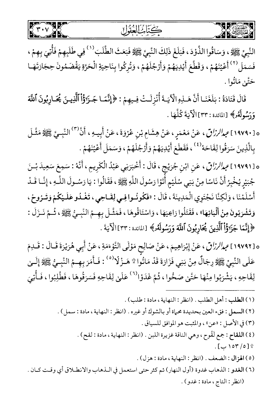 ° [١٩٧٩١] عبد الرزاق، عَنِ ابْنِ جُرَيْجٍ، قَالَ: أَخْبَرَنِي عَبْدُ الْكَرِيمِ، أَنَّهُ: سَمِعَ سَعِيدَ بْنَ جُبَيْرٍ يُخْبِرُ أَنَّ نَاسًا مِنْ بَنِي سُلَيْمٍ أَتَوْا رَسُولَ اللَّهِ - صلى الله عليه وسلم -، فَقَالُوا: يَا رَسُولَ اللَّهِ، إِنَّا قَدْ أَسْلَمْنَا، وَلكنَّا نَجْتَوِي الْمَدِينَةَ، قَالَ: "فَكُونُوا فِي لِقَاحِي، تَغْدُو عَلَيكُمْ وَتَرُوح، وَتَشْرَبُونَ مِنْ أَلْبَانِهَا"، فَقَتَلُوا رَاعِيَهَا، وَاسْتَاقُوهَا، فَمَثَّلَ بِهِمُ النَّبِيُّ - صلى الله عليه وسلم -، ثُمَّ نَزَلَ: {إِنَّمَا جَزَاءُ الَّذِينَ يُحَارِبُونَ اللَّهَ وَرَسُولَهُ} [المائدة: ٣٣] الْآيَةَ.