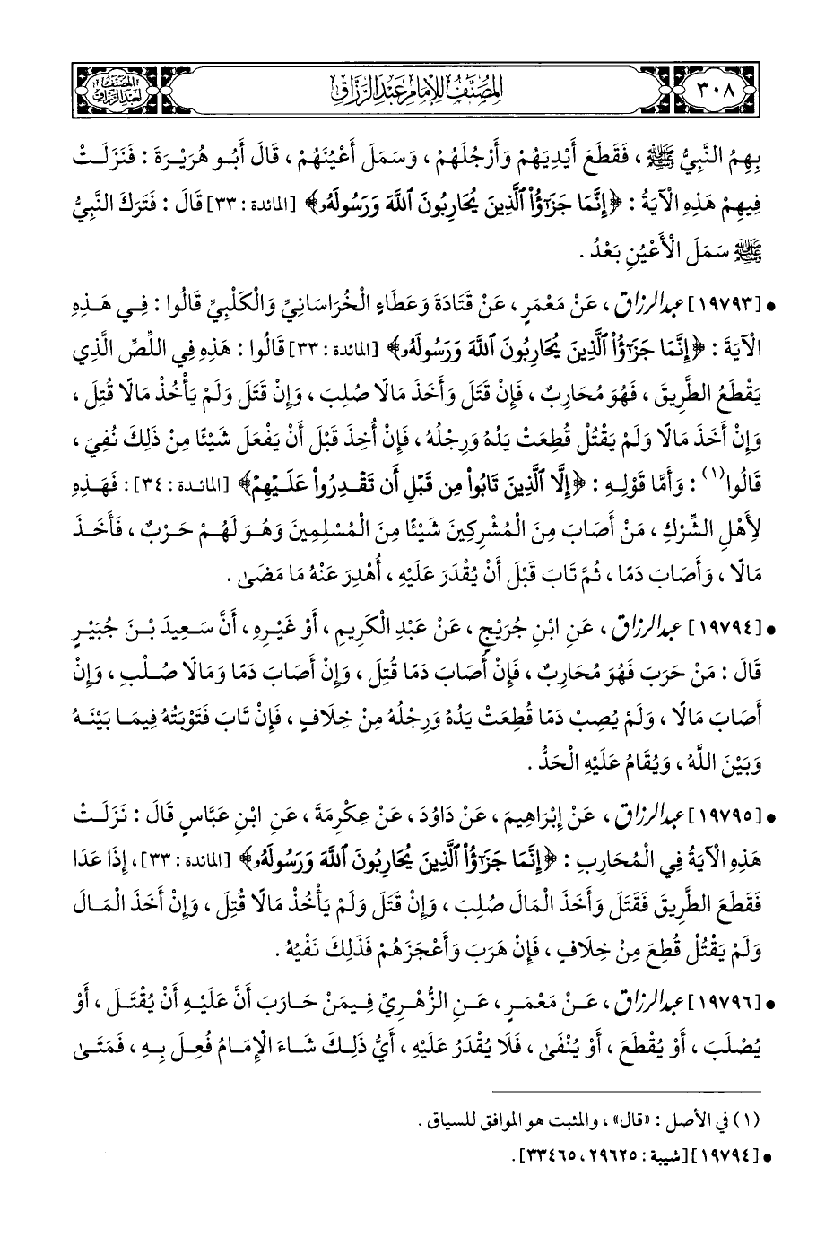 • [١٩٧٩٣] عبد الرزاق، عَنْ مَعْمَرٍ، عَنْ قَتَادَةَ وَعَطَاءٍ الْخُرَاسَانِيِّ وَالْكَلْبِيِّ قَالُوا: فِي هَذِهِ الْآيَةَ: {إِنَّمَا جَزَاءُ الَّذِينَ يُحَارِبُونَ اللَّهَ وَرَسُولَهُ} [المائدة: ٣٣] قَالُوا: هَذِهِ فِي اللِّصِّ الَّذِي يَقْطَعُ الطَّرِيقَ، فَهُوَ مُحَارِبٌ، فَإِنْ قَتَلَ وَأَخَذَ مَالًا صُلِبَ، وإِنْ قَتَلَ وَلَمْ يَأْخُذْ مَالًا قُتِلَ، وإِنْ أَخَذَ مَالًا وَلَمْ يَقْتُلْ قُطِعَتْ يَدُهُ وَرِجْلُه، فَإِنْ أُخِذَ قَبْلَ أَنْ يَفْعَلَ شَيْئًا مِنْ ذَلِكَ نُفِيَ، قَالُوا (¬١): وَأَمَّا قَوْلِهِ: {إِلَّا الَّذِينَ تَابُوا مِنْ قَبْلِ أَنْ تَقْدِرُوا عَلَيْهِمْ} [المائدة: ٣٤]: فَهَذِهِ لِأَهْلِ الشِّرْكِ، مَنْ أَصَابَ مِنَ الْمُشْرِكِينَ شَيْئًا مِنَ الْمُسْلِمِينَ وَهُوَ لَهُمْ حَرْبٌ، فَأَخَذَ مَالًا، وَأَصَابَ دَمًا، ثُمَّ تَابَ قَبْلَ أَنْ يُقْدَرَ عَلَيْهِ، أُهْدِرَ عَنْهُ مَا مَضَى.